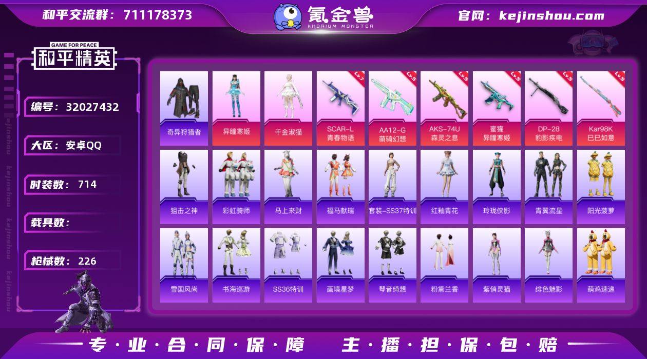 实名:可二次实名 是否支持人脸包赔:不支持 粉装数量:2 特效枪数量:6 时装数:714 枪械数:226 奇异狩猎者 异瞳寒姬,千金淑猫 七级SCAR-L-青春物语,五级AA12-G-萌骑幻想,五级AKS-74U-森灵之息,五级蜜獾-异瞳寒姬,五级DP-28-豹影疾电,五级Kar98K-巳巳如意 狙击之神,彩虹骑师,马上来财,福马献瑞,红釉青花,SS37特训,雨过天青,玲珑侠影,青翼流星,阳光菠萝,雪国风尚,画境星梦,琴音绮想,书海巡游,SS36特训,奇异狩猎者,炫彩糖果,粉黛兰香,绯色魅影,萌鸡速递,紫俏灵猫,风迹短诗,秘语星愿,SS35特训,午间小调,元气之梦,薄荷星砂,狂鲨锋刃,凌霄紫焰,擎苍青焰,SS34特训套装,朱霞炽焰,暗黑骑手,冰川特警,冰冻风暴,缤纷果语,冰河战士,爆裂葡萄,白色伏地魔,春光漫游,长空猛禽,潮流炫酷,潮流游乐家,超能勇士,苍穹猎鹰,春日漫步,创世·追猎,晨曦薄雾,纯真浪花,蝶变,大橘大利,电音精灵,飞驰魅影,绯格组合,粉红小猪,疯狂小兔子,福星高照,飞行日记,龟仙人,光之冒险,海岛探路者,鹤鸣,虎虎生威吉莉,湖蓝色名流,幻世保卫者,黑色刀锋,黑色伏地魔,黄色伏地魔,黄色名流,黄色运动,红色运动,幻世战舞者,黑夜传说,幻影武者,极地朋克,惊鸿侠骨,橘黑制服,娇憨猪猪,竞技名士,坚韧舞者,极速竞梦,舰行太空,锦衣飞扬,酷潮明星,空岛之星,快闪甜心,蓝冰羽,蓝彩潮人,龙的传人,龙魂突击队,猎鹰,浪漫假日,猎梦纪元,浪漫天命,蓝色运动,龙腾端午,恋语绒绒,冷焰舞者,漫步者,猛禽,萌黄之夏,魅力单车,麻辣教官,懵萌河马,萌趣咩咩,萌趣颜团子,蜜桃派对,卖崽青蛙,霓虹极客,霓虹街区,柠萌假日,牛气冲天,牛气满满,破蛋小黄鸡,破晓战魂,绮丽涂鸦,青年教官,青涩时光,清新柠檬,青玉碎影,青羽突袭者,绒宝小鹅,瑞龙福将,荣耀,热情海星,沙漠兵团,沙漠毒蛇,神秘领域,神气柴柴,SS17特训,SS18特训,SS19特训,SS20特训,SS21特训,SS22特训,SS23特训,SS24特训,SS25特训,SS26特训,SS27特训,SS28特训,SS29特训,SS30特训套装,SS31特训套装,SS32特训套装,巳巳如意,探宝勇士,涂山之恋,特训学院,甜心亚梦,团圆交子,特战英豪,特战装甲,完美偶像,王牌教练,炫蓝之夏,旭日情侣,夏日音浪,雪山精英,香桃花海,星途旅人,新侠客行,虚音幻奏,异彩先驱,荧惑魅影,雨林探路者,音速流光,玉兔迎春,野性战心,鹰眼刺客,鱼渊荷华,燕燕于飞,异域银装,紫幽梦,灼焰舞者 炫彩糖果飞行器,绝对恒星降落伞,炫彩糖果降落伞,异瞳寒姬降落伞,环太平洋降落伞,精灵梦叶罗丽降落伞,忍者神龟降落伞,未来歌姬降落伞 卖家说:时装总共有714个
