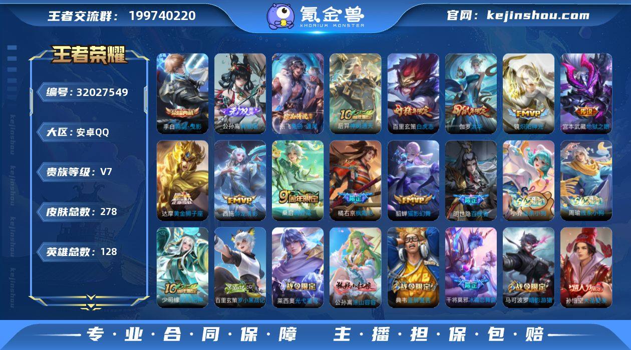 CHC11031 安卓Q-V7-最强王者段位-128英雄-278皮肤-1典藏皮肤-1无双-1珍品传说-10传说-82史诗 【英雄全皮】:孙权全皮,橘右京全皮,敖隐全皮 【荣耀典藏】:李白鸣剑曳影 【无双皮肤】:公孙离离恨烟 【珍品传说】:张飞兔狲蓬尾 【传说皮肤】:后羿神树通天,桑启鸣野蒿,橘右京枫霜尽,西施游龙清影,镜炽阳神光,伽罗太华,貂蝉猫影幻舞,达摩黄金狮子座,百里玄策白虎志,宫本武藏地狱之眼 【限定皮肤】:白起狰,公孙离离恨烟,姜子牙天穹之誓,狄仁杰阴阳师,赵云皇家上将,嬴政白昼王子,孙尚香蔷薇恋人,鲁班七号狮舞东方,庄周高山流水,高渐离玩趣恶龙,阿轲迷踪丽影,白起夜都怪侠,芈月重明,吕布猎兽之王,吕布御风骁将,周瑜赤莲之焰,元歌云间偶戏,夏侯惇朔风刀,甄姬游园惊梦,曹操烛龙,典韦穷奇,典韦蓝屏警告,马可波罗暗影游猎,狄仁杰魔术师,狄仁杰万华元夜,达摩沙漠行僧,项羽海滩派对,老夫子醍醐杖,程咬金演武夺筹,刘邦夺宝奇兵,韩信飞衡,韩信傲雪梅枪,兰陵王驯魔猎人,兰陵王金庭之子,橘右京枫霜尽,亚瑟潮玩骑士王,孙悟空大圣娶亲,牛魔御旌,后羿圣弓游侠,李元芳银河之约,李元芳云中旅人,钟馗神迹守卫,钟馗驱傩正仪,杨玉环遇见飞天...