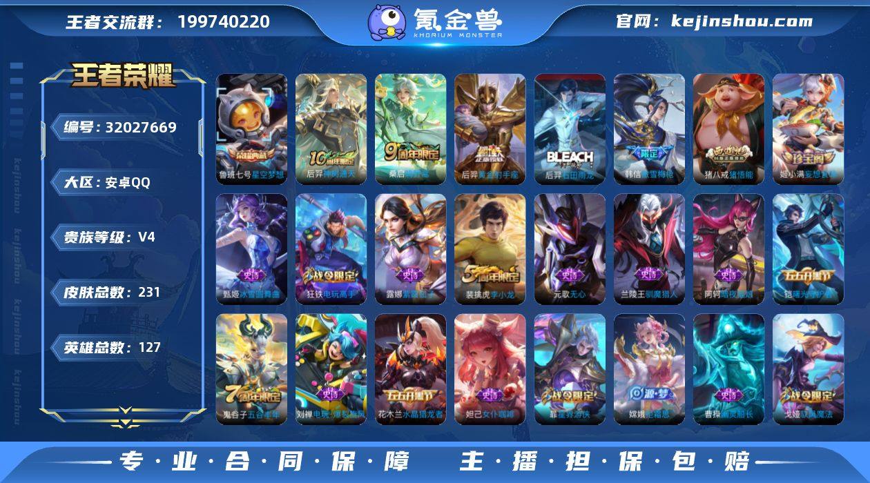 【4797】安卓Q-V4-尊贵铂金III段位-127英雄-231皮肤-1典藏皮肤-3传说-67史诗 【荣耀典藏】:鲁班七号星空梦想 【传说皮肤】:后羿神树通天,桑启鸣野蒿,后羿黄金射手座 【限定皮肤】:姜子牙天穹之誓,狄仁杰阴阳师,赵云皇家上将,墨子神迹守卫,嬴政优雅恋人,孙尚香蔷薇恋人,庄周高山流水,白起夜都怪侠,芈月幻夜卜梦,周瑜赤莲之焰,元歌无心,夏侯惇朔风刀,甄姬游园惊梦,狄仁杰魔术师,狄仁杰万华元夜,达摩沙漠行僧,项羽海滩派对,老夫子醍醐杖,老夫子航海奇遇记,程咬金演武夺筹,韩信傲雪梅枪,王昭君午后时光,兰陵王驯魔猎人,兰陵王金庭之子,后羿圣弓游侠,李元芳银河之约,李元芳云中旅人,钟馗驱傩正仪,干将莫邪真爱魔法,蔡文姬繁星吟游,鬼谷子原初探秘者,鬼谷子五谷丰年,黄忠火炮绅士,苏烈千军破阵,弈星混沌棋,沈梦溪星空之诺,沈梦溪大漠名商,明世隐疑决卦,明世隐吟游魔法,裴擒虎李小龙,裴擒虎擒涛扼浪,狂铁电玩高手,云中君纤云弄巧,猪八戒猪悟能,嫦娥拒霜思,嫦娥暖冬兔眠,西施玲珑珍味,鲁班大师探海日志,桑启海盐诗旅,暃星界游侠,戈娅驭风魔法,阿古朵江河有灵,张良古海寻踪,鬼谷子天穹祈灯,姬小满妄想食味,刘邦剑破天穹,程咬金群星魔术团,周瑜熔金海岸 【赛季限定】:夏侯惇朔风刀,弈星混沌棋,明世隐疑决卦,老夫子醍醐杖,鬼谷子原初探秘者,狄仁杰万华元夜,程咬金演武夺筹,钟馗驱傩正仪,苏烈千军破阵,达摩沙漠行僧,兰陵王金庭之子,沈梦溪大漠名商,李元芳云中旅人,桑启海盐诗旅,裴擒虎擒涛扼浪,鲁班大师探海日志,张良古海寻踪,鬼谷子天穹祈灯,刘邦剑破天穹,姜子牙天穹之誓,东皇太一噬灭天穹,太乙真人谧流熔炉,钟馗虚灵犬护,甄姬逆浪荇歌,亚瑟荣光之誓 【战令限定】:兰陵王驯魔猎人,周瑜赤莲之焰,李元芳银河之约,沈梦溪星空之诺,...