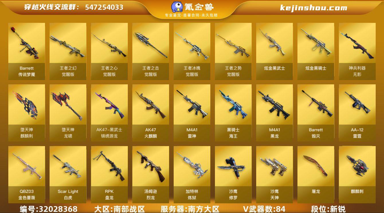 【ky5247】南方大区-28V-0王者武器数-0炫金武器数 【传说角色】:传说星骇 【热门武器】:M200-幻神,M4A1-黑骑士 【音效卡】:AWM-裁决音效卡,沙鹰-修罗-盛典舞曲音效卡*2,Barrett-碧霄极光音效卡,炼狱-百战金芒-庆典舞曲音效卡 【皮肤】:M200-幻神-黄忠皮肤,裁决-运输船 皮肤,M4A1-战神赵云,M4A1-再燃火线,火麒麟-战神关羽,毁灭-虹光风暴 皮肤,轻型军用手斧-再燃火线 【角色】:王者潘多拉,奇洋探员,乔伊教练,云海玲珑,初恋灵狐,风暴女,潘多拉-甜心教官,斯沃特-X,兔囡囡 【人偶武器】:星神-炽天使,迷你深渊冰龙 【暴走生化】:超级对讲机 【挑战大师】:神圣爆裂者-末日III 【英雄级武器】:AK47-火麒麟,M4A1-雷神,M4A1-黑骑士,Barrett-毁灭,AWM-裁决,M200-幻神,炼狱-百战金芒,龙啸,幻灵之锋*2,麒麟刺-百战金芒,高爆手雷-幻灵*2,闪光弹-幻灵*5,烟雾弹-幻灵*3,M4A1-赤狱骑士,Barrett-碧霄极光 【道具】:CFS限定背包,百战金芒炫彩背包,女皇终结者-魔龙之吻,绿色巨人,灵魂忍者,变异宝贝,迷雾幽灵,夺命之镰,防化服*3,金色流光-枪王排位*2,流光-再燃火线,枪王排位28赛季金色流光,枪王排位29赛季金色流光,语音特效-盛典烟火,萌萌小葵表情,电玩兔兔表情,炽雪表情,EP战队名片,防弹头盔*4,防弹衣*4,C4工具钳*4,手雷包*4 【特殊枪械】:1黑骑士