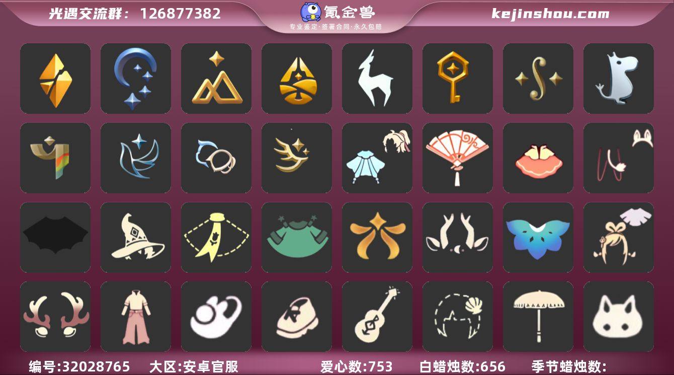 账号类型: 手机账号 季节已毕业: 圣岛季,预言季,梦想季,小王子季,风行季,潜海季,表演季,破晓季,欧若拉季,夜行季,追忆季,拾光季,归巢季,九色鹿季,彩染季,双星季 完成地图: 雨林,霞谷,暮土,禁阁 珍稀物品: 鳐鲲斗篷,阿努比斯(狗头),白枭,透明蝶翼斗,玫瑰花,彩虹围巾 礼包: 蝙蝠套,围巾,绊爱,大铁头,运动鞋,瑞雪,跷跷板,彩虹帽,橘子,贝壳,兔子,雪花,星月头饰,四叶草,滑板,新年耳钉,创始人,姆明饰品套装,献瑞折扇礼包 裤子: 武士裤,背带裤,搓澡巾,王子服,蓝绿裤,风行毕业裤子 面具: 阿努比斯,凤凰面具,呼吸面具,夜行毕业面具,黄眉企鹅面具,辉光羚羊面具 面饰: 红耳机,黑框眼镜 项链: 围巾 发型: 归巢毕业发型,若笠,虚荣,单侧绑发,小王子发型,留辫蘑菇头,飞天盘发 头饰: 行军锅头盔,羽毛发饰,牛仔帽,蓝色音乐会,平顶帽 斗篷: 蟑螂斗,绿芽,粉红绒毛斗篷,遥鲲斗篷,燕尾斗篷,冥龙斗篷,领主红斗篷,瑞雪斗篷,彩染围巾斗篷 配饰: 雨伞,高音钢琴,小红伞,相机,玫瑰花,圆鼓,蓝色手碟,鲲灯 亮点: 【优质装备】:预言季,阿努比斯(狗头),表演季,白枭(帝企鹅发),武士裤,圣岛季,梦想季,小王子季(王子季),风行季,潜海季,破晓季,鳐鲲斗篷,透明蝶翼斗,欧若拉季(欧若拉),归巢毕业发型(五塑彩羽发),行军锅头盔(六边锅帽子)(双耳锅帽子),羽毛发饰(多羽发饰),高音钢琴(白色高脚钢琴),玫瑰花,夜行季,追忆季,牛仔帽(西部帽),小红伞(姆明红伞)(姆明大伞),相机(季卡相机),拾光季,彩虹围巾(五塑彩带斗),归巢季,九色鹿(九色鹿季),王子服(小王子套装),蓝绿裤(高领舞服),蟑螂斗(凤凰斗篷),围巾(肩带),蝙蝠套(蝙蝠斗篷)(南瓜头),红耳机,雨林,霞谷,墓土(暮土),禁阁,若笠(箬笠),风行毕业裤子(羽袖长袍),凤凰面具,呼吸面具(潜水面具),夜行毕业面具(棕熊面具),黄眉企鹅面具,黑框眼镜(粗框眼镜),单侧绑发(单边小辫),小王子发型,留辫蘑菇头,粉红绒毛斗篷(绒...