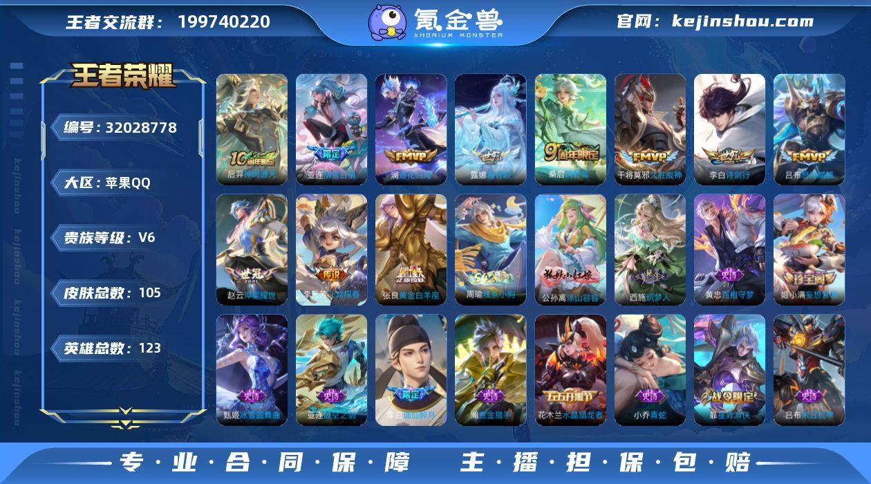 实名: 可修改 性别: 女号 贵族等级: V6 英雄数: 123 皮肤数: 105 传说皮: 黄金白羊座,久胜战神,飞鸢探春,淬星耀世,霜月吟,澜逐花归海,落雪白狼,神树通天 限定皮: 诗剑行,怒海麟威,鸣野蒿 亮点: 【优质装备】:黄金白羊座,久胜战神,飞鸢探春,淬星耀世,霜月吟,澜逐花归海,涂山容容