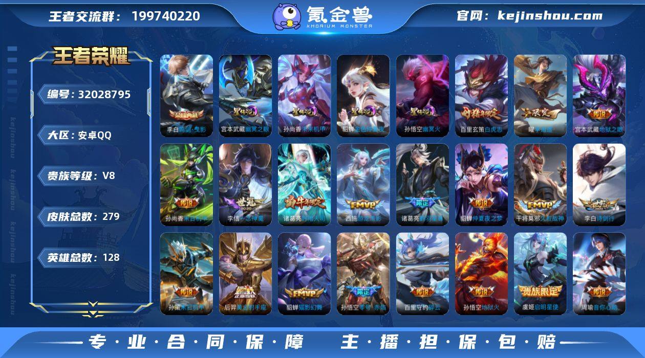 贵族等级:V8 典藏皮肤数:1 珍品无双皮肤数:0 无双皮肤数:0 珍品传说皮肤数:0 传说皮肤数:20 史诗皮肤数:75 皮肤数:279 英雄数:128 段位:王者