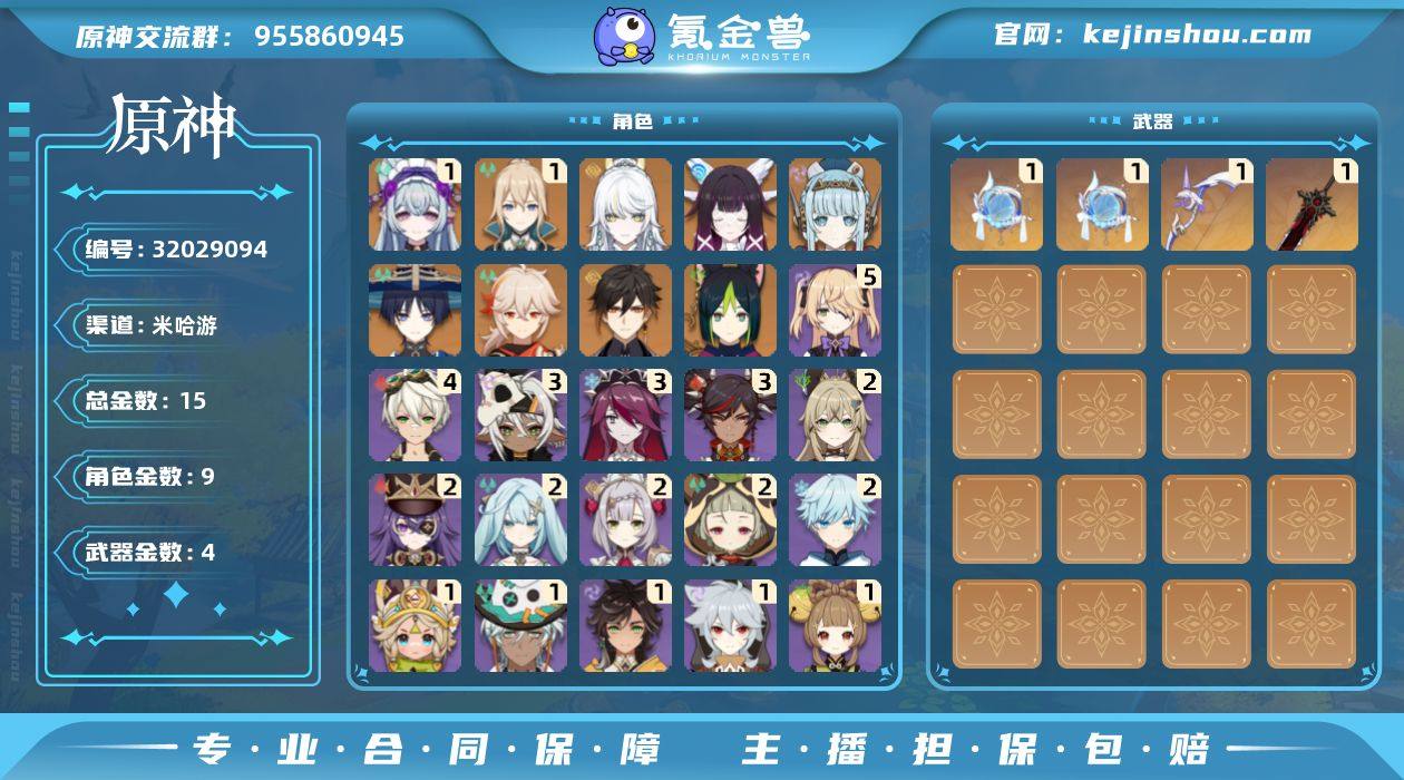 冒险等级:56 总黄数:15 5星角色数:9 5星武器数:4 原石数量:1507 相遇之缘数量:0 纠缠之源数量:0 1命梦见月瑞希,1命琴,0命兹白,0命哥伦比娅,0命伊涅芙,0命流浪者,0命枫原万叶,0命钟离,0命提纳里 5命菲谢尔,4命班尼特,3命伊安珊,3命罗莎莉亚,3命辛焱,2命绮良良,2命夏沃蕾,2命重云,2命珐露珊,2命诺艾尔,2命早柚,1命卡齐娜,1命赛索斯,1命伊法,1命雷泽,1命瑶瑶,0命叶洛亚,0命爱诺,0命菲米尼,0命嘉明,0命久岐忍,0命琳妮特,0命香菱,0命行秋,0命安柏,0命芭芭拉,0命北斗,0命迪奥娜,0命凯亚,0命卡维,0命坎蒂丝,0命柯莱,0命丽莎,0命凝光,0命砂糖,0命托马,0命五郎,0命烟绯,0命云堇 精1帷间夜曲,精1阿莫斯之弓,精1狼的末路 100%侦察骑士,古恩希尔德的传承,致教会自由人 卖家说:自己看图,深渊11,下半随便打看你手法了,可以砍价