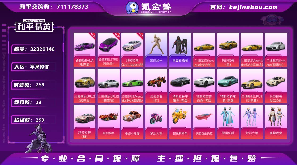 苹果 微信-无敌战神框-49粉装-24特效枪-23载具-13粉色飞行器-190378热力值-23王牌印记-259套装-299枪皮 【红色载具】:路特斯ELETRE(电光紫)(六级),路特斯EVIJA(电光紫)(六级),玛莎拉蒂Quattroporte(幻星粉)(一级) 【热门品类】:粉装-雪国幻梦,粉装-梦幻火箭,粉装-童趣迷兔,粉装-缤纷油彩,套装-浪漫天命,套装-冥河战士,套装-奇异狩猎者,角色-军刀雅典娜,套装-星河浪客,套装-潮萌小黄鸭,套装-暗影哥特,套装-浪漫波比 【粉色套装】:粉装-深海曼妙,粉装-独舞天鹅,粉装-数码大师,粉装-甜心巧克力,粉装-宝贝奶油派,粉装-天使彩虹糖,粉装-水曜玄武,粉装-金曜白虎,粉装-雪国幻梦,粉装-蝶舞迷情,粉装-精灵迷巫,粉装-梦幻火箭,粉装-天启纪元,粉装-星之信仰,粉装-金风玉露,粉装-缤纷油彩,粉装-PEL轰鸣竞梦者,粉装-新星烈龙,粉装-苍蓝魅影,粉装-冰霜白皇,粉装-童趣迷兔,粉装-炙焰红王,粉装-相思残雪,粉装-暗夜玫瑰,角色-零号机款机体服,角色-初号机款机体服,角色-2号机款机体服,粉装-绚金瑰梦,粉装-甜心娃娃,粉装-精灵娃娃,粉装-酣梦娃娃,粉装-暗星紫秘,粉装-天之羽翼,粉装-焦糖拿铁,粉装-海盐物语,粉装-薄荷物语,粉装-橘柚倾心,粉装-星夜魔法师,粉装-圣光天使,粉装-妙趣可丽,角色-复仇流浪者,粉装-彩虹甜喵,蜀山剑侠-李逍遥,女娲后裔-赵灵儿,粉装-盖世英雄,粉装-霞光圣骑,粉装-寒光使者,角色-歌者泠鸢,粉装-暗夜鎏金 【粉色枪皮等级】:AKM-甜心宝贝(三级),AKM-炫紫旋律(一级),AKM-梦之光华(三级),AKM-盖世英雄(九级),M16A4-垂柳戏鸭(一级),SCAR-L-梦幻火箭(一级),SCAR-L-童趣迷兔(一级),SCAR-L-天蓬元帅(八级),M416-五爪金龙(一级),M416-心之恋语(三级),M416-暖熊萌萌(五级),M416-至情至圣(九级),GROZA-香水柠檬(四级),GROZA-焦糖拿铁(...