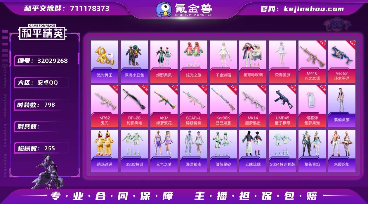 实名: 可修改 时装数: 798 枪械数: 255 热门装扮: 深海小丑鱼,鹰眼刺客,绿野柔风,激萌罗小黑,神秘黑猫,派对舞王,炫光之旅,千金淑猫,星穹咏叹调,荧海星豚 稀有枪皮: M416心之恋语,Vector环太平洋,AKM绿萝繁花,SCAR-L-锦绣绵绵,UMP45量子极限,Kar98K-巳巳如意,M762-鬼刀,MK14-甜梦熊击,烟雾弹-甜梦果泡,DP-28-豹影疾电 亮点: 【优质装备】:派对舞王(小金鞋),Mark.06(新蓝螳螂),舞王派对(派对舞王、小金鞋),暗影哥特(红眼罩),七级Vector-环太平洋,七级M416-心之恋语