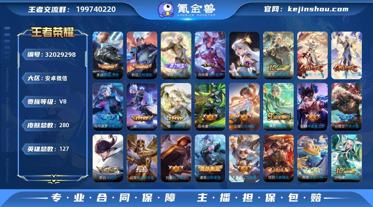 安卓WX-V8-最强王者段位-127英雄-280皮肤-2典藏皮肤-1无双-16传说-79史诗 【英雄全皮】:孙权全皮,空空儿全皮,影全皮 【荣耀典藏】:李白鸣剑曳影,韩信弑枪猎影 【无双皮肤】:李白碎月剑心 【传说皮肤】:后羿神树通天,司空震愿照山河定,澜愿照九州拓,云缨幻光神枪,桑启鸣野蒿,澜逐花归海,孙悟空齐天大圣,李白诗剑行,马可波罗深海之息,李元芳飞鸢探春,镜炽阳神光,虞姬启明星使,刘备时之恋人,后羿黄金射手座,貂蝉仲夏夜之梦,孙尚香末日机甲 【限定皮肤】:大乔绒语心约,姜子牙天穹之誓,李白谪仙醉月,狄仁杰阴阳师,赵云皇家上将,赵云引擎之心,孙尚香蔷薇恋人,高渐离死亡摇滚,钟无艳超时空战士,吕布猎兽之王,元歌无心,甄姬落雪兰心,马可波罗暗影游猎,马可波罗深海之息,马可波罗山海玄木吟,狄仁杰魔术师,项羽海滩派对,老夫子圣诞老人,孙悟空至尊宝,孙悟空孙行者,孙悟空齐天大圣,李元芳银河之约,李元芳云中旅人,虞姬启明星使,雅典娜黎明之约,蔡文姬繁星吟游,鬼谷子五谷丰年,百里玄策原初追逐者,梦奇顽趣,沈梦溪大漠名商,裴擒虎李小龙,云中君纤云弄巧,嫦娥暖冬兔眠,鲁班大师探海日志,桑启海盐诗旅,暃星界游侠,艾琳女武神,艾琳流音漫舞,阿古朵江河有灵,张良古海寻踪,蒙恬荣光圣徽,高渐离燃音魔法,妲己灵卜魔法,鬼谷子天穹祈灯,李白碎月剑心,沈梦溪龙舞盛年,鲁班七号蔬乡物语,李元芳蔬乡物语,刘邦剑破天穹,周瑜熔金海岸 【年限皮肤】:马可波罗山海玄木吟,司空震愿照山河定,澜愿照九州拓 【赛季限定】:沈梦溪大漠名商,李元芳云中旅人,桑启海盐诗旅,鲁班大师探海日志,张良古海寻踪,鬼谷子天穹祈灯,刘邦剑破天穹,姜子牙天穹之誓,东皇太一噬灭天穹,太乙真人谧流熔炉,钟馗虚灵犬护,甄姬逆浪荇歌,亚瑟荣光之誓,百里玄策原初追逐者,雅典...