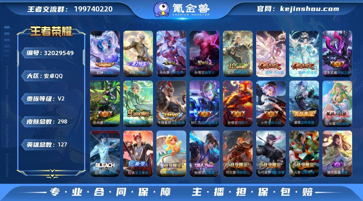 可二次【特价出售/店主推荐/女号】:安卓Q-V8-至尊星耀V段位-127英雄-298皮肤-1典藏皮肤-1无双-2星元-11传说-84史诗 【英雄全皮】:影全皮 【荣耀典藏】:貂蝉幻阙歌 【无双皮肤】:李白碎月剑心 【传说皮肤】:后羿神树通天,妲己愿照众生和,虞姬愿照岁时盈,桑启鸣野蒿,小乔音你心动,虞姬启明星使,干将莫邪久胜战神,孙尚香末日机甲,宫本武藏地狱之眼,孙悟空地狱火,狄仁杰超时空战士 【限定皮肤】:姜子牙天穹之誓,狄仁杰阴阳师,赵云皇家上将,赵云龙胆,嬴政优雅恋人,鲁班七号狮舞东方,庄周高山流水,高渐离玩趣恶龙,阿轲迷踪丽影,钟无艳王者之锤,扁鹊奇幻香踪,周瑜赤莲之焰,元歌云间偶戏,元歌无心,夏侯惇朔风刀,典韦穷奇,马可波罗暗影游猎,狄仁杰魔术师,狄仁杰万华元夜,项羽海滩派对,老夫子醍醐杖,刘邦夺宝奇兵,兰陵王驯魔猎人,亚瑟潮玩骑士王,孙悟空至尊宝,牛魔御旌,后羿如梦令,李元芳银河之约,李元芳云中旅人,虞姬启明星使,钟馗神迹守卫,杨玉环遇见飞天,杨戬潮玩骑兵,雅典娜单词大作战,蔡文姬繁星吟游,鬼谷子原初探秘者,鬼谷子五谷丰年,弈星混沌棋,沈梦溪星空之诺,明世隐疑决卦,裴擒虎李小龙,裴擒虎擒涛扼浪,狂铁御狮,米莱狄御霄,云中君纤云弄巧,盾山御銮,猪八戒西部大镖客,上官婉儿梁祝,嫦娥暖冬兔眠,西施玲珑珍味,蒙犽狂想玩偶喵,鲁班大师探海日志,桑启海盐诗旅,暃星界游侠,戈娅驭风魔法,艾琳流音漫舞,司空震地狱燃心,阿古朵江河有灵,张良古海寻踪,高渐离燃音魔法,妲己灵卜魔法,鬼谷子天穹祈灯,李白碎月剑心,伽罗琥珀纪元,沈梦溪龙舞盛年,周瑜熔金海岸 【年限皮肤】:赵云龙胆 【赛季限定】:夏侯惇朔风刀,典韦穷奇,狄仁杰万华元夜,老夫子醍醐杖,张良古海寻踪,牛魔御旌,李元芳云中旅人,鬼谷子原初探秘者,弈星混沌棋,明世...