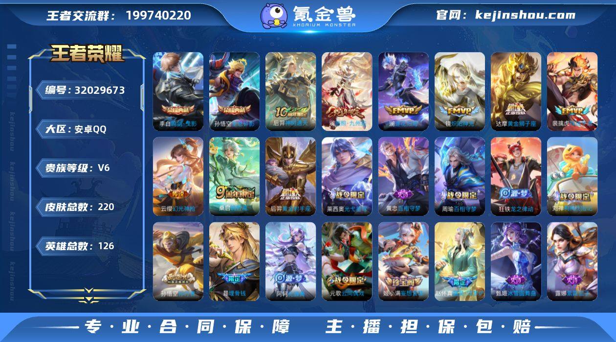 保证金商家 安全第一 找回包赔安卓Q-V6-最强王者段位-126英雄-220皮肤-2典藏皮肤-9传说-49史诗【荣耀典藏】:孙悟空全息碎影,李白鸣剑曳影【传说皮肤】:后羿神树通天,澜愿照九州拓,云缨幻光神枪,裴擒虎祥瑞亨通,桑启鸣野蒿,澜逐花归海,镜炽阳神光,达摩黄金狮子座,后羿黄金射手座【限定皮肤】:暃埋骨钱,蒙犽顽岩魄,蔡文姬夏日便利店,虞姬夏日便利店,姜子牙天穹之誓,杨戬破阵退雄兵,狄仁杰阴阳师,赵云皇家上将,孙尚香蔷薇恋人,元歌云间偶戏,狄仁杰魔术师,狄仁杰万华元夜,项羽海滩派对,老夫子醍醐杖,程咬金演武夺筹,孙悟空孙行者,李元芳银河之约,女娲朔望之晖,雅典娜黎明之约,百里玄策原初追逐者,弈星混沌棋,裴擒虎擒涛扼浪,上官婉儿梁祝,鲁班大师探海日志,阿古朵江河有灵,张良古海寻踪,鬼谷子天穹祈灯,姬小满妄想食味,鲁班七号蔬乡物语,李元芳蔬乡物语,刘邦剑破天穹,程咬金群星魔术团,关羽决胜骁骑,镜青焰无极,项羽苍威无极,刘备异域游侠,周瑜熔金海岸【赛季限定】:狄仁杰万华元夜,老夫子醍醐杖,程咬金演武夺筹,张良古海寻踪,雅典娜黎明之约,百里玄策原初追逐者,弈星混沌棋,裴擒虎擒涛扼浪,鲁班大师探海日志,鬼谷子天穹祈灯,刘邦剑破天穹,姜子牙天穹之誓【战令限定】:蔡文姬夏日便利店,虞姬夏日便利店,元歌云间偶戏,李元芳银河之约,女娲朔望之晖,鲁班七号蔬乡物语,李元芳蔬乡物语,镜青焰无极,项羽苍威无极 【史诗皮肤】:露娜紫霞仙子,赵云皇家上将,赵云未来纪元,甄姬冰雪圆舞曲,王昭君偶像歌手,狄仁杰魔术师,宫本武藏鬼剑武藏,孙尚香蔷薇恋人,孙尚香水果甜心,嬴政摇滚巨星,妲己魅力维加斯,妲己女仆咖啡,李白千年之狐,张飞乱世虎臣,小乔缤纷独角兽,兰陵王暗隐猎兽者,诸葛亮黄金分割率,铠曙光守护者,李元芳逐浪之夏,孙策猫...