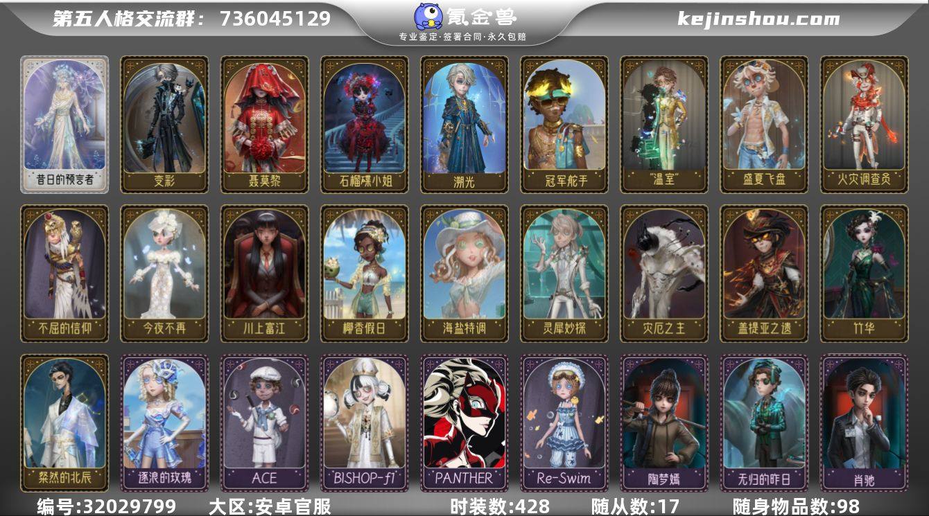 阅历等级:47 时装数:428 虚妄杰作时装数:1 稀世时装数:18 奇珍时装数:76 随从数:17 稀世随从数:0 奇珍随从数:6 随身物品数:98 虚妄杰作随身物品数:0 稀世随身物品数:12 奇珍随身物品数:32 角色数:63 先知-昔日的预言者 入殓师-变彩,调香师-聂莫黎,小女孩-石榴碟小姐,病患-溯光,击球手-冠军舵手,入殓师-“温室”,勘探员-盛夏飞盘,灵狐-火灾调查员,先知-不屈的信仰,调香师-今夜不再,梦之女巫-川上富江,咒术师-椰香假日,调酒师-海盐特调,“囚徒”-灵犀妙探,黄衣之主-灾厄之主,勘探员-盖提亚之遗,红蝶-竹华,宿伞之魂-粲然的北辰,调酒师-逐浪的玫瑰,杂技演员-ACE,拉拉队员-BISHOP-f1,舞女-PANTHER,机械师-Re-Swim 卖家说:可商量