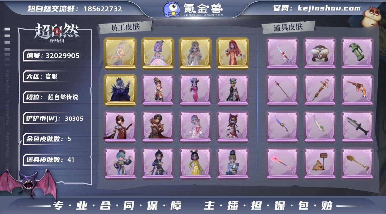 金皮5;紫皮15;道具皮41;皮肤:薇薇安-圣光之谕,逍遥-莲华渡,巫铃儿-镜花辞,小黄-遗失的童话,零-渡鸦公爵,零-搬开山,阿念-王子与骑士,逍遥-泽引山海,薇薇安-黑月挽歌,爱丽丝-丝缕哀歌,爱丽丝-甜梦派对,逍遥-绣春逍影,爱丽丝-耀眼的你,薇薇安-仙锋小姐,阿念-庆宴绮愿,零-青云逸歌,阿念-迷途僵宝,小黄-呱呱雨衣,莉莉-莓果陷阱,艾伦-黎明猎手;道具:摸金符-花落精绝,短管猎枪-赞萌露比水枪,铲子-赞萌波板糖,刺刀-紫气东来,铲子-圣心之泪,刺刀-小鲨匕首,急救包-末章心跳,急救包-蔷薇物语,腰包-月下莲台,腰包-惊魂娃娃,长鞭-新春炸响,桃木剑-凤鸣九天,刺刀-铂刺与红萼,桃木剑-永眠曲,闪光弹-金戈玄铜,转轮手枪-新星时代,短管猎枪-星光的裁决,长鞭-小狗蛇点点鞭,腰包-宝剑八,传送按钮-逆时审判,摸金符-祝祷词,刺刀-碧络琅环,夜视仪-金丝眼镜,音响-鸣沙鼓,专业手电-花束般的告白,铲子-龙鳞,额外的背包-飞花令,长鞭-缚誓之锁,专业手电-云端梦想计划,桃木剑-绯色遗证,黄牛能量饮料-雪顶奇愿,桃木剑-最后的独角兽,喷气背包-乘风溯雪,长枪-罪棘,急救包-土拨鼠捏捏,黄牛能量饮料-青玉抱丹,铲子-卡皮巴拉小黄豚铲,传送按钮-幻宠之门,音响-happy猫,黄牛能量饮料-珍珠芭乐莓莓,伞-伞;美妆:美妆-暗夜小恶魔;饰品:头饰-雪墩墩头套,头饰-蒜了八,头饰-面具马头套,头饰-呆滞头套,头饰-小财神豚豚头套,头饰-烈焰红唇头套,头饰-嘻嘻头套,头饰-萨卡班甲鱼头套,头饰-太空鲨头套,头饰-惊魂南瓜头套,头饰-火爆了头套,头饰-樱桃奶油布丁,头饰-大葱明头套,头饰-马上有钱,头饰-小狗蛇点点头套,头饰-鱼头怪头套,头饰-卑微头套,头饰-滑稽头套,头饰-驼半仙头套,头饰-精致露比头套,头饰-炙热烧烤,头饰-鳄霸天头套,头饰-哈士奇头套,头饰-烛光纪念,头饰-腊肠扭扭,头饰-像素朋克墨镜,头饰-后室幸存者头套,挂饰-九色祥鹿,挂饰-未竟乐园,挂饰-小鲨...