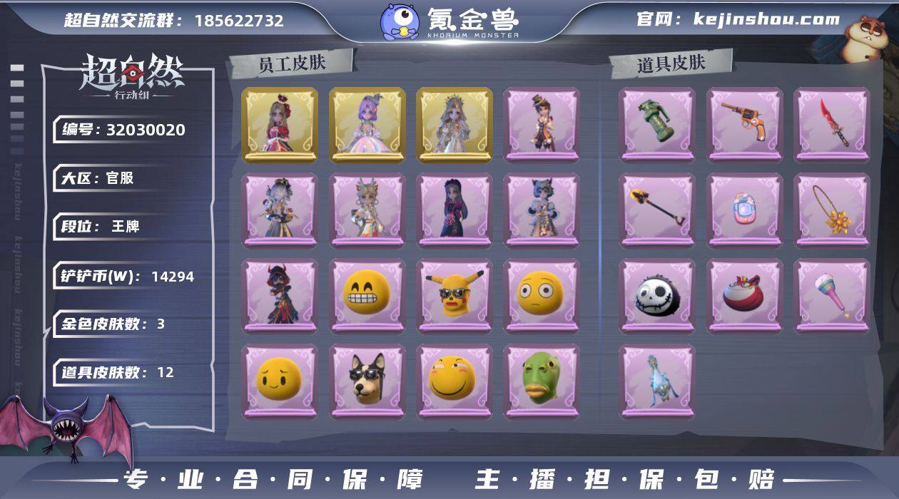 金皮3;紫皮6;道具皮12;皮肤:小黄-遗失的童话,爱丽丝-血色中的玛丽,薇薇安-圣光之谕,小黄-霓裳踏雪,莉莉-除妖小师妹,爱丽丝-丝缕哀歌,阿念-庆宴绮愿,零-赤炼将军,阿念-灵昭鹿鸣;道具:喷气背包-乘风溯雪,摸金符-花落精绝,铲子-焰骨,闪光弹-金戈玄铜,专业手电-云端梦想计划,刺刀-赤色之刃,腰包-惊魂娃娃,转轮手枪-新星时代,腰包-绯红柴郡猫,黄牛能量饮料-青玉抱丹,传送按钮-幻宠之门,急救包-蔷薇物语;饰品:头饰-哈士奇头套,头饰-嘻嘻头套,头饰-萨卡班甲鱼头套,头饰-滑稽头套,头饰-面具马头套,头饰-驼半仙头套,头饰-烈焰红唇头套,头饰-呆滞头套,头饰-卑微头套,头饰-蒜了八,头饰-咬咬鲨头套,头饰-鱼头怪头套,头饰-哞哞牛头套,头饰-粽小宝头套,头饰-像素朋克墨镜,头饰-后室幸存者头套,挂饰-未竟乐园,挂饰-小小玛丽,挂饰-糖果守卫,背饰-蝶恋花,背饰-兔先生的时钟;动作:动作-新年摇,动作-星奇摇,动作-舞台中心,动作-敲门舞,动作-抬手,动作-旋转舞,动作-举牌,动作-痞帅进行曲,动作-要糖;工牌背景:工牌背景-卷珠帘,工牌背景-舞台终演,工牌背景-童话扉页,工牌背景-点点萌伴,工牌背景-圣光之誓;工牌动作:工牌动作-盛气凌人,工牌动作-虔诚之姿;员工:艾伦,员工-爱德华,员工-逍遥,员工-莉莉,员工-零,员工-临云,员工-薇薇安,员工-小黄,员工-爱丽丝,员工-小满,员工-兰,员工-巫铃儿,员工-阿念;累充988元;铲铲币1429.4万;金砖4;段位:王牌Ⅱ;魔盒等级:1