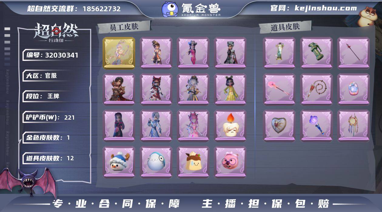 金皮1;紫皮10;道具皮12;皮肤:逍遥-莲华渡,零-青云逸歌,莉莉-除妖小师妹,零-搬开山,小黄-呱呱雨衣,莉莉-情公主,阿念-庆宴绮愿,莉莉-莓果陷阱,爱丽丝-耀眼的你,艾伦-黎明猎手,爱丽丝-丝缕哀歌;道具:传送按钮-浮生一梦,传送按钮-幻宠之门,音响-鸣沙鼓,急救包-蔷薇物语,铲子-赞萌波板糖,长鞭-缚誓之锁,黄牛能量饮料-无人岸,腰包-宝剑八,长枪-罪棘,闪光弹-金戈玄铜,专业手电-星寂,伞-伞;饰品:头饰-哈士奇头套,头饰-腊肠扭扭,头饰-小财神豚豚头套,头饰-萨卡班甲鱼头套,头饰-嘻嘻头套,头饰-火爆了头套,头饰-樱桃奶油布丁,头饰-鱼头怪头套,头饰-雪墩墩头套,头饰-蒜了八,头饰-精致露比头套,头饰-面具马头套,头饰-烛光纪念,头饰-呆滞头套,头饰-烈焰红唇头套,头饰-太空鲨头套,头饰-卑微头套,头饰-滑稽头套,头饰-马上有钱,头饰-小狗蛇点点头套,头饰-像素朋克墨镜,头饰-后室幸存者头套,挂饰-晚安小熊,挂饰-尘封旧事,背饰-牛啤背包,背饰-白鼬趴趴,背饰-小小白光莹,背饰-小小情公主;动作:动作-新年摇,动作-心跳摇,动作-青海摇,动作-舞台中心,动作-luvaboy,动作-七仔摇,动作-要糖,动作-拜年,动作-举牌,动作-带你逃跑吧,动作-蝴蝶步,动作-抬手;工牌背景:工牌背景-卷珠帘,工牌背景-复活的肖像,工牌背景-流金照庭,工牌背景-情语塔;工牌动作:工牌动作-虔诚之姿,工牌动作-元气剪刀手,工牌动作-轻躯鹤立,工牌动作-鸦影;员工:艾伦,员工-薇薇安,员工-爱德华,员工-阿念,员工-临云,员工-零,员工-兰,员工-逍遥,员工-巫铃儿,员工-小满,员工-莉莉,员工-小黄,员工-爱丽丝;累充395元;铲铲币22.1万;金砖8;段位:王牌Ⅱ;魔盒等级:26