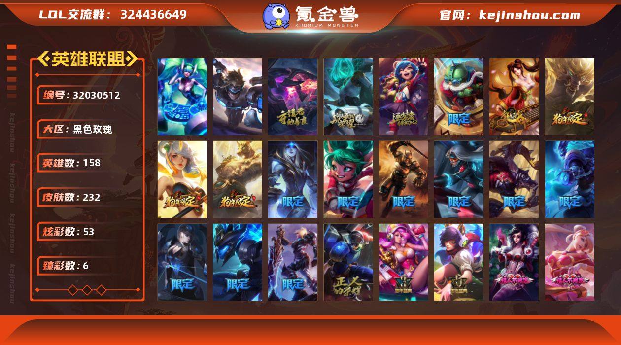 【LDC2703】158英雄/232皮肤/2终极/4神话/56限定/6臻彩/53炫彩/26传说/48史诗/未定级/10周年 安妮/源代码 乐芙兰/暗星 科加斯/10周年庆典 凤凰/春晖神女/春晖神女 拉克丝 流风回雪/无畏骑士 瑟庄妮 赤子初心/冠军之箭 艾希 凯旋圣装/闭月之颜 貂蝉 炫金莲华/偶像歌手 阿狸 极地雪莲/霸天巨兽·雪崩 墨菲特/古琴余韵 娑娜/南天之怒 沃里克/北辰之威 内瑟斯/春晖神女 拉克丝/甜心宝贝 娑娜/觅心猎手 薇恩/觅心女王 寒冰/幸福女神 乐芙兰/圣诞精灵 崔丝塔娜/圣诞狂欢 时光/胡桃夹子 小丑/平安夜女神 娑娜/冬季仙境 卡尔玛/邪恶圣诞老人 维迦/冰雪节 茂凯/雪装 奈德丽/圣诞老人 酒桶/圣诞驯鹿 克格莫/魄罗骑士 瑟庄妮/圣诞老人 布隆/冰雪节 炼金/DJ-娑娜/未来战士/冠军之刃 锐雯/冠军典狱长 锤石/冠军之矛 卡莉丝塔/冠军之箭 艾希/S1FNC 酒桶/S1FNC 库奇/S2 暗杀星 努努/S2 暗杀星 慎/S3 SKT T1 贾克斯/S3 SKT T1 李青/S3 SKT T1 薇恩/S4 SSW 炼金/S4 SSW 图奇/S4 SSW 雷恩加尔/S4 SSW 锤石/S5 SKT T1 滑板鞋/S5 SKT T1 蜘蛛/S6 SKT T1 烬/3周年 厄运小姐/5周年 阿狸/胜利枪神 格雷福斯/胜利女神 奥莉安娜/胜利之剑 亚托克斯/大魔王 提莫/鬼影森森 茂凯/魅惑女巫 崔丝塔娜/魅惑女巫 莫甘娜/泳池派对 厄运小姐/外星装甲 库奇/波比的巧克力工坊/创战纪 希维尔/都铎王朝 图奇/御星魔矢 艾希/防暴天使 凯尔/警用试作体K-9 内瑟斯/邪鸦魅影 乐芙兰/大天使长米迦勒 凯尔/战场女武神 凯尔/恶魔男爵 瑞兹/女皇 艾希/源计划:联合 艾希/西部天使 艾希/鬼魂新娘 莫甘娜/绅士 科加斯/战地巨兽 科加斯/双重冰晶 艾尼维亚/女主播 迦娜/陆地王者4WD 布里茨/冰川巨兽 墨菲特/地狱行者 孙悟空/丧尸 布兰德/源计划:净化 薇恩/炼狱魔犬 内瑟斯/死亡骑士 盖伦/星之守护者 拉克丝/枯萎之壤 泽拉斯/焰尾妖狐 阿狸/偶像歌手 阿狸/泳池派对 吉...