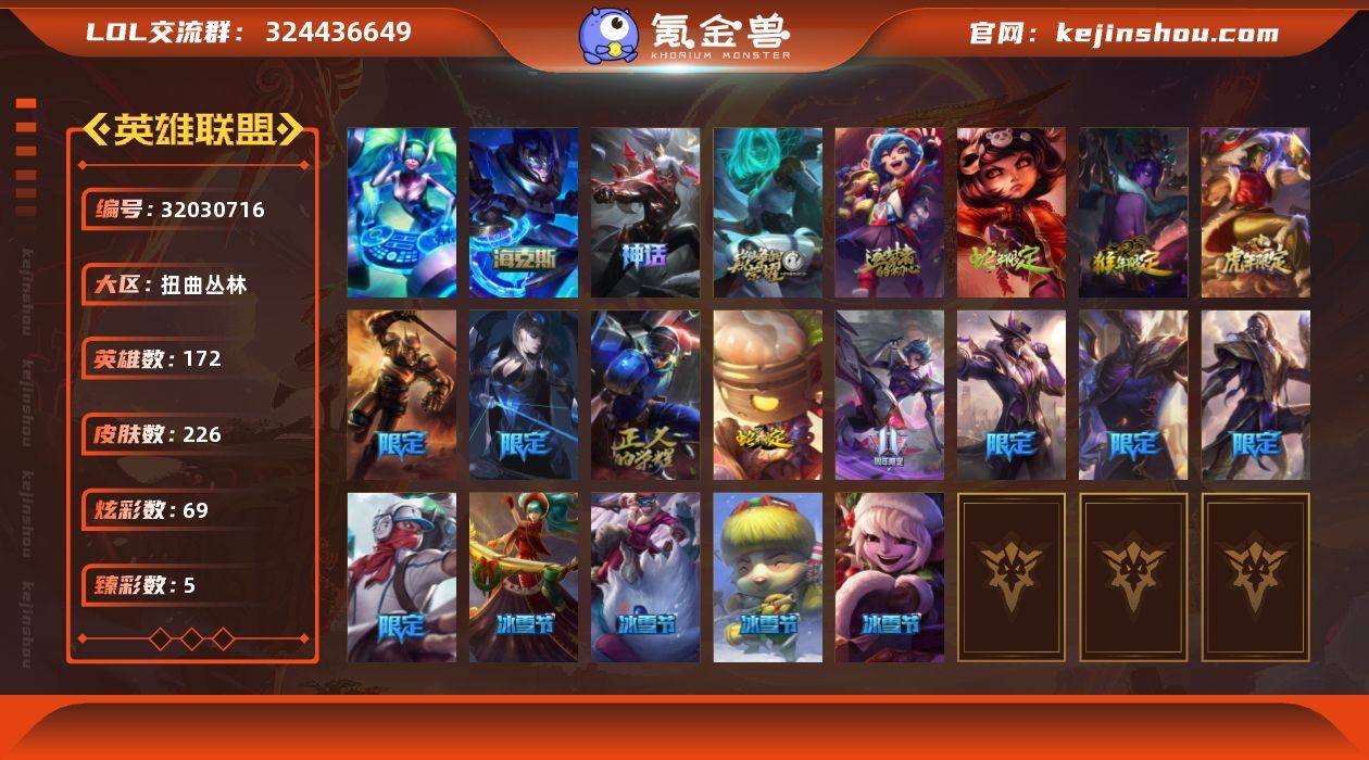 【LOLF2754】172英雄/226皮肤/1终极/4神话/25限定/5臻彩/69炫彩/29传说/45史诗/未定级/10周年 安妮/源代码 乐芙兰/殿堂传奇 薇恩/海克斯 嘉文四世/咖啡甜心 金克丝 核桃巴菲/魔女 阿卡丽 虚荣/净雪之月 莫甘娜 冬虹/预知之眼 亚索 不怠/“你看见过我的熊猫吗?” 安妮/碧玉之牙 卡西奥佩娅/紫金罗刹 莫甘娜/龙腾虎跃 瑟提/点心宝贝 阿木木/觅心游侠卢锡安/圣诞开心鬼 提莫/圣诞精灵 崔丝塔娜/胡桃夹子 小丑/平安夜女神 娑娜/魄罗骑士 瑟庄妮/DJ-娑娜/冠军之箭 艾希/S4 SSW 炼金/11周年 卡蜜尔/暗裔英雄 盖伦/胜利之剑 亚托克斯/胜利枪神 卢锡安/胜利之运 崔斯特/胜利女神-菲奥娜/鬼影森森 茂凯/克烈古拉伯爵/魅惑女巫 奈德丽/防暴天使 凯尔/警用试作体K-9 内瑟斯/战地机甲 厄加特/血石领主 弗拉基米尔/大天使长米迦勒 凯尔/源计划:林 易/墨之影武者 易/恶魔男爵 瑞兹/烈焰雄心 崔丝塔娜/女皇 艾希/西部天使 艾希/绅士 科加斯/双重冰晶 艾尼维亚/女警狙击 凯特琳/陆地王者4WD 布里茨/太空律动 “猫猫” 布里和里茨/源计划:泯灭 雷克顿/神拳 李青/炼狱魔犬 内瑟斯/冰霜亚龙 希瓦娜/苍穹之光 韦鲁斯/泳池派对 吉格斯/金牌主播 德莱文/灌篮高手 德莱厄斯/神王 德莱厄斯/蔷薇绅士 杰斯/神龙尊者 昼日真龙 亚索/神龙尊者 夜月幻龙 亚索/暗星尊 烬/真实伤害 艾克/灵魂莲华 瑟提/铁钩船长 费德提克/地狱火 阿利斯塔/战场公主 希维尔/钢铁之心 希维尔/熊猫 提莫/荒野豺狼 沃里克/黑帮狂花 厄运小姐/国王 泰达米尔/少林武僧 贾克斯/熔火之心 拉莫斯/血石诅咒 塔里克/绝代智将 斯维因/古墓丽影 凯特琳/海贼魅影 卡特琳娜/符文战神 雷克顿/腥红之月 伊莉丝/三昧真火 孙悟空/防弹武僧 李青/地下拳王 李青/战地机甲 斯卡纳/生化博士 黑默丁格/四神之力 乌迪尔/军神战甲 波比/血色之锤 波比/飞车暴走族 古拉加斯/冰川勇者 伊泽瑞尔/...