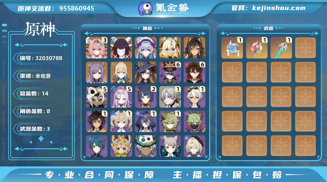 冒险等级:55 总黄数:14 5星角色数:8 5星武器数:3 原石数量:20 相遇之缘数量:0 纠缠之源数量:0 3命瓦雷莎,0命哥伦比娅,0命梦见月瑞希,0命希诺宁,0命迪希雅,0命刻晴,0命琴,0命莫娜 6命嘉明,6命夏沃蕾,5命爱诺,5命伊安珊,2命香菱,1命叶洛亚,1命班尼特,1命赛索斯,1命芭芭拉,1命柯莱,1命莱依拉,0命菲米尼,0命久岐忍,0命卡齐娜,0命琳妮特,0命绮良良,0命行秋,0命伊法,0命安柏,0命珐露珊,0命菲谢尔,0命凯亚,0命丽莎,0命砂糖,0命烟绯 精1帷间夜曲,精1溢彩心念,精1天空之刃 100%侦察骑士,古恩希尔德的传承,星与月之约 卖家说:大保底19抽月卡剩28天