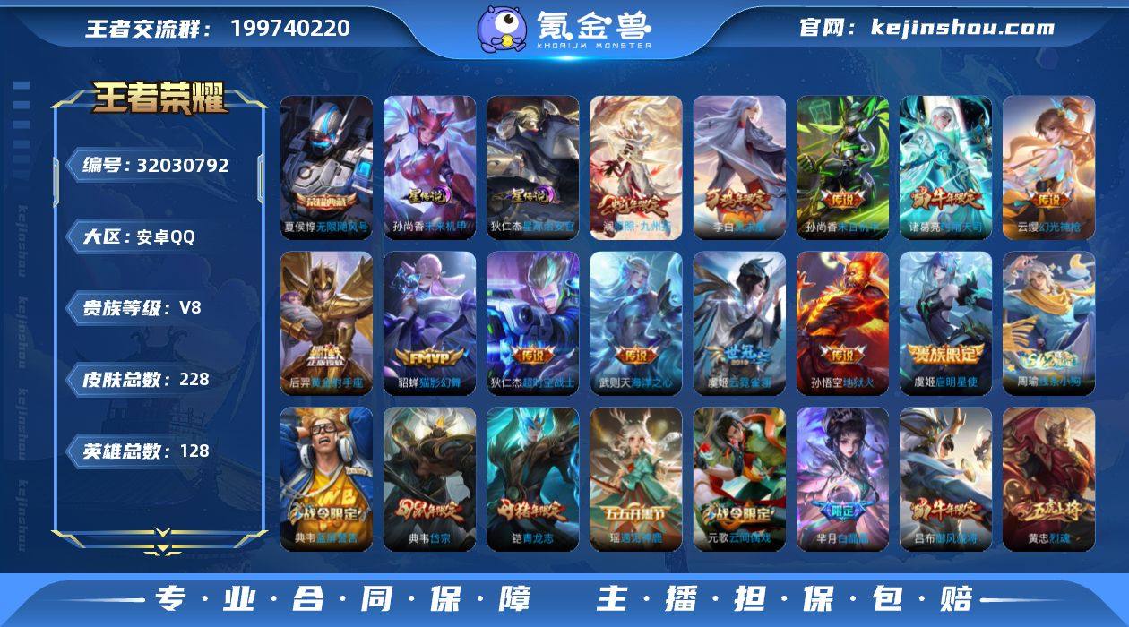 【特价出售/店主推荐】:安卓Q-V8-尊贵铂金III段位-128英雄-228皮肤-1典藏皮肤-1典藏英雄-2星元-12传说-54史诗 【英雄全皮】:影全皮 【荣耀典藏】:武则天英雄,夏侯惇无限飓风号 【传说皮肤】:澜愿照九州拓,云缨幻光神枪,诸葛亮时雨天司,虞姬启明星使,貂蝉猫影幻舞,虞姬云霓雀翎,后羿黄金射手座,李白凤求凰,孙尚香末日机甲,孙悟空地狱火,武则天海洋之心,狄仁杰超时空战士 【限定皮肤】:白起狰,狄仁杰阴阳师,赵云皇家上将,赵云龙胆,墨子神迹守卫,妲己时之彼端,孙尚香蔷薇恋人,庄周蜃楼王,庄周玄嵩,庄周高山流水,阿轲迷踪丽影,芈月重明,芈月白晶晶,吕布猎兽之王,吕布御风骁将,周瑜赤莲之焰,元歌云间偶戏,夏侯惇朔风刀,甄姬幽恒,曹操烛龙,典韦穷奇,典韦蓝屏警告,典韦岱宗,狄仁杰魔术师,狄仁杰万华元夜,达摩星际陆战队,达摩沙漠行僧,项羽海滩派对,老夫子醍醐杖,程咬金演武夺筹,刘邦夺宝奇兵,兰陵王驯魔猎人,花木兰瑞麟志,亚瑟潮玩骑士王,牛魔御旌,后羿如梦令,后羿圣弓游侠,李元芳银河之约,李元芳云中旅人,虞姬启明星使,钟馗神迹守卫,钟馗驱傩正仪,女娲朔望之晖,干将莫邪真爱魔法,雅典娜单词大作战,蔡文姬繁星吟游,太乙真人饕餮,东皇太一逐梦之光,鬼谷子原初探秘者,诸葛亮时雨天司,黄忠烈魂,铠青龙志,苏烈千军破阵,弈星混沌棋,沈梦溪星空之诺,沈梦溪大漠名商,明世隐疑决卦,裴擒虎李小龙,裴擒虎擒涛扼浪,狂铁御狮,米莱狄御霄,米莱狄胡桃异想国,云中君纤云弄巧,盾山御銮,猪八戒西部大镖客,上官婉儿梁祝,蒙犽狂想玩偶喵,鲁班大师探海日志,桑启海盐诗旅,张良古海寻踪 【年限皮肤】:李白凤求凰,花木兰瑞麟志,铠青龙志,庄周玄嵩,甄姬幽恒,典韦岱宗,诸葛亮时雨天司,吕布御风骁将,澜愿照九州拓 【赛季限定】:庄周蜃楼王,白起...