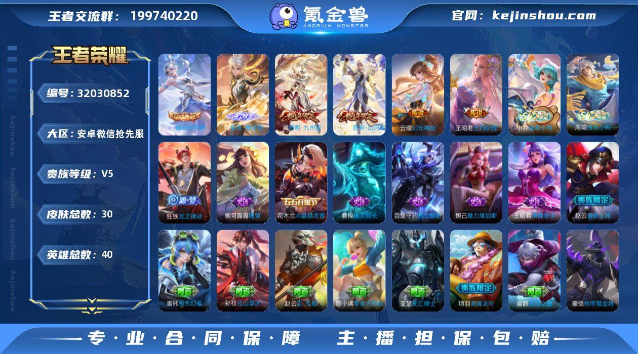 贵族等级:V5 典藏皮肤数:1 珍品无双皮肤数:0 无双皮肤数:1 珍品传说皮肤数:0 传说皮肤数:4 史诗皮肤数:9 皮肤数:30 英雄数:40 段位:星耀