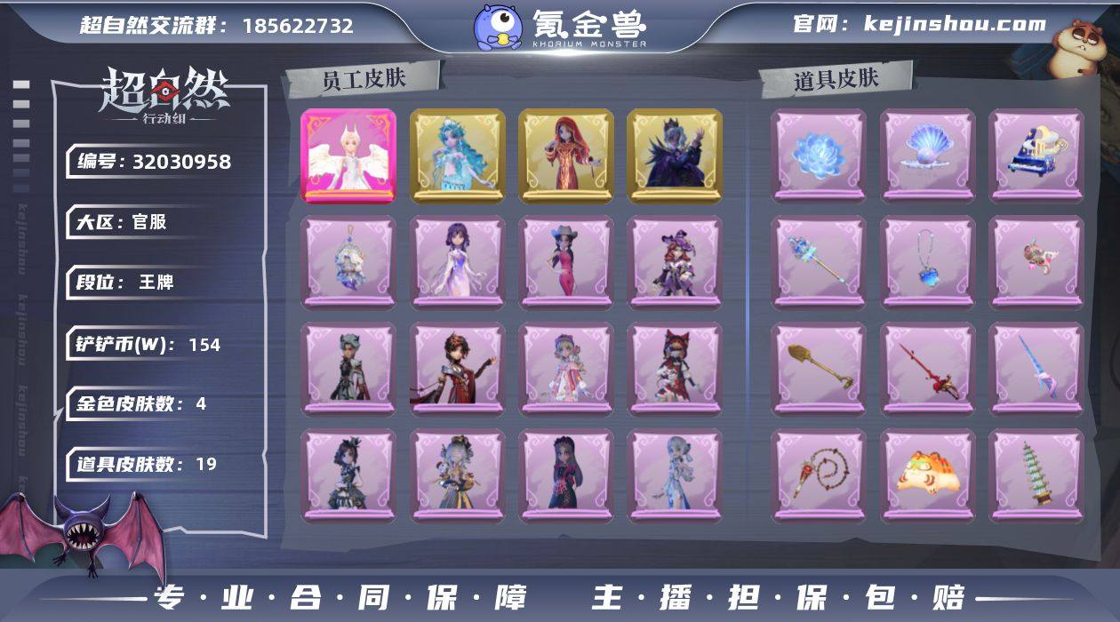 金色皮肤数量: 4 紫色皮肤数量: 12 道具皮肤数量: 19 段位: 王牌 员工: 逍遥,薇薇安,巫铃儿,莉莉,阿念,艾伦,小黄,零,爱丽丝,爱德华,兰,小满,临云 外观: 镜花辞,丝缕哀歌,素影瑶光,情公主,嘻嘻头套,烈焰红唇头套,呆滞头套,卑微头套,哈士奇头套,滑稽头套,鱼头怪头套,面具马头套,萨卡班甲鱼头套,蝶恋花,钗头凤,除妖小师妹,梵音莲华,九色祥鹿,火爆了头套,异色序曲,精致露比头套,惊魂南瓜,莓果陷阱,潮汐小海兔,甜梦派对,班卓琴,寻凉记,樱桃奶油布丁,仙锋小姐,千夜星谕,渡鸦公爵,雪墩墩头套,太空鲨头套,子夜证词,黎明猎手,耀眼的你,炽天使,醉花阴,不朽的今夜,牛啤背包,海月息潮,琢玉怀乡,饺饺者头套,夜浮船,孤独对望
