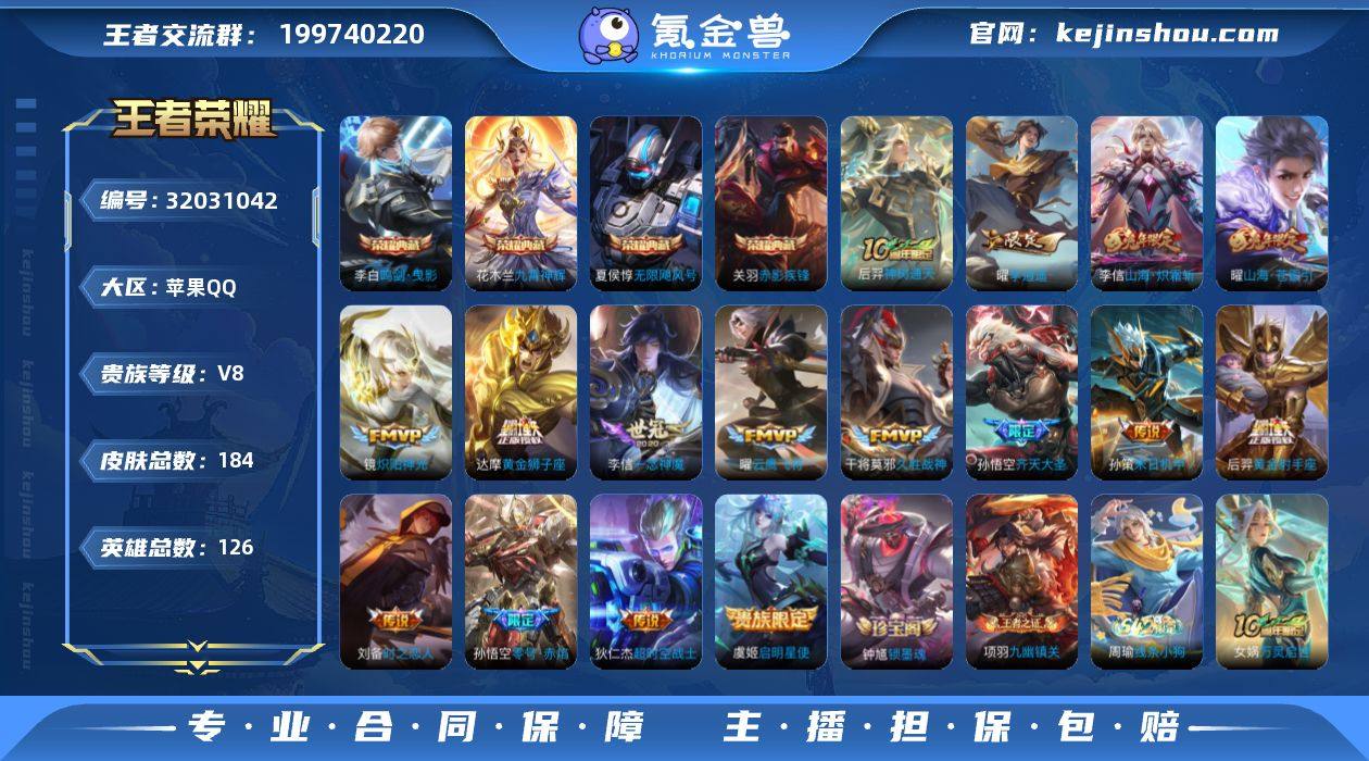 无二次-苹果Q-V8-最强王者段位-125英雄-177皮肤-4典藏皮肤-16传说-52史诗HZ251229014 【英雄全皮】:李信全皮 【荣耀典藏】:夏侯惇无限飓风号,李白鸣剑曳影,花木兰九霄神辉,关羽赤影疾锋 【传说皮肤】:后羿神树通天,孙悟空齐天大圣,曜山海苍雷引,李信山海炽霜斩,孙策末日机甲,曜李逍遥 ,镜炽阳神光,虞姬启明星使,孙悟空零号赤焰,曜云鹰飞将,李信一念神魔,刘备时之恋人,干将莫邪久胜战神,达摩黄金狮子座,后羿黄金射手座,狄仁杰超时空战士 【限定皮肤】:狄仁杰阴阳师,赵云皇家上将,嬴政优雅恋人,钟无艳超时空战士,元歌无心,夏侯惇朔风刀,甄姬落雪兰心,典韦岱宗,狄仁杰魔术师,狄仁杰万华元夜,项羽海滩派对,老夫子醍醐杖,关羽冰锋战神,韩信飞衡,兰陵王金庭之子,孙悟空大圣娶亲,孙悟空零号赤焰,孙悟空齐天大圣,李元芳云中旅人,虞姬启明星使,钟馗驱傩正仪,鬼谷子原初探秘者,鬼谷子五谷丰年,铠青龙志,百里玄策原初追逐者,百里守约朱雀志,弈星混沌棋,梦奇顽趣,沈梦溪大漠名商,明世隐疑决卦,裴擒虎李小龙,裴擒虎擒涛扼浪,云中君纤云弄巧,李信山海炽霜斩,盾山御銮,上官婉儿梁祝,嫦娥暖冬兔眠,曜李逍遥 ,曜山海苍雷引,鲁班大师探海日志,盘古冰霜神祇,桑启海盐诗旅,暃星界游侠,阿古朵江河有灵,张良古海寻踪,蒙恬荣光圣徽 【年限皮肤】:百里守约朱雀志,铠青龙志,韩信飞衡,典韦岱宗,马超神威,李信山海炽霜斩,曜山海苍雷引 【赛季限定】:夏侯惇朔风刀,狄仁杰万华元夜,老夫子醍醐杖,兰陵王金庭之子,张良古海寻踪,李元芳云中旅人,钟馗驱傩正仪,鬼谷子原初探秘者,百里玄策原初追逐者,弈星混沌棋,梦奇顽趣,沈梦溪大漠名商,明世隐疑决卦,裴擒虎擒涛扼浪,盾山御銮,鲁班大师探海日志,桑启海盐诗旅,蒙恬荣光圣徽 【战令限定】:钟无艳超时空...