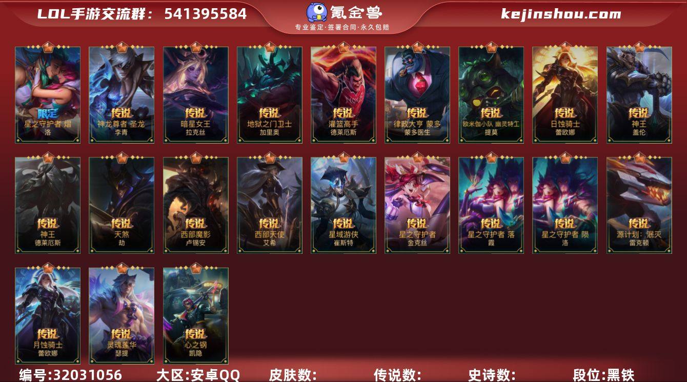 [17330444]1神话 1限定 21传说 180皮肤 可二次 可修改实名 【神话皮】夜星流火 金克丝 【限定皮肤】赵云子龙 【传说皮】神龙尊者 圣龙 李青,心之钢凯隐,灵魂莲华腕豪,北极星神 黛安娜,地狱之门卫士,西部天使寒冰,西部魔影卢锡安,天煞劫,神王诺手,神王盖伦,日蚀骑士蕾欧娜,星之守护者金克丝,欧米伽小队 幽灵特工,律政大亨,灌篮高手,星域游侠卡牌,暗星女王拉克丝,源计划:泯灭,月蚀骑士蕾欧娜,星之守护者 陨,星之守护者 落