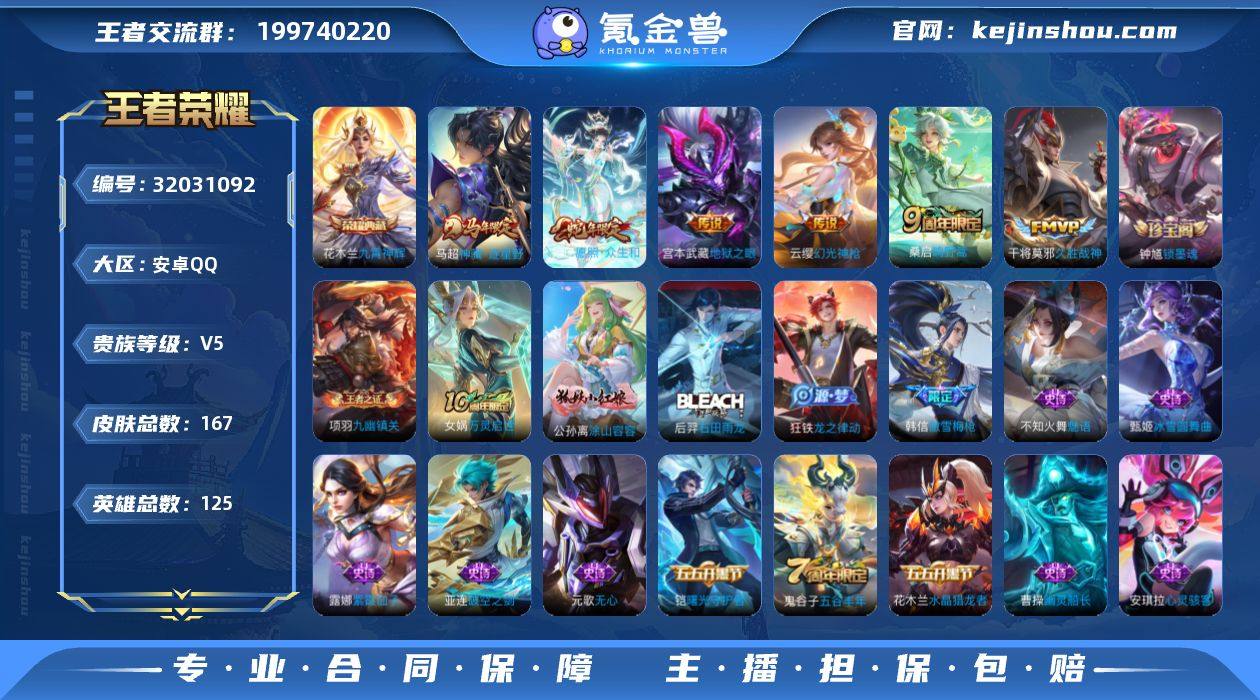 【王者荣耀】珍品无双0 典藏1 无双0 珍品传说0 传说6 史诗54 英雄125 皮肤167 贵族5级 荣耀典藏:九霄神辉__传说皮肤:鸣野蒿|地狱之眼|久胜战神|幻光神枪|愿照·众生和|神骥·逐星野__稀有限定:傲雪梅枪|梁祝|大漠名商|高山流水|古海寻踪|海滩派对|海盐诗旅|皇家上将|剑破天穹|江河有灵|金庭之子|千军破阵|擒涛扼浪|驱傩正仪|热情桑巴|荣光圣徽|沙漠行僧|探海日志|天穹祈灯|玩趣恶龙|无心|五谷丰年|午后时光|阴阳师|银河之约|游园惊梦|原初追逐者|暗隐猎兽者|缤纷独角兽|冰雪圆舞曲|乘风破浪|功夫厨神|鬼剑武藏|金属风暴|吕布-末日机甲|玫瑰异探|魅力维加斯|魅语|梦奇-顽趣|偶像歌手|绅士熊喵|圣诞狂欢|圣诞恋歌|诗语江南|水果甜心|水晶猎龙者|孙策-猫狗日记|天才门将|天秀·启明|鹰眼统帅|幽灵船长|逐浪之夏|紫霞仙子|噬灭天穹|敬我三分|破空之剑|天穹之誓|曙光守护者|心灵战警|特工魅影|心灵骇客|星界战将|谧流熔炉|万物之道|云中旅人|孙悟空-神迹守卫|刘禅-鸭鸭历险记|沈梦溪-鸭鸭历险记|龙之律动|布丁狗之约|虚灵犬护|石田雨龙|逆浪荇歌|孙策-百相守梦|周瑜-百相守梦|黄忠-百相守梦|涂山容容|荣光之誓|万灵启世|鹤鸣心笺|九幽镇关|周瑜-线条小狗|锁墨魂__优质皮肤:年年有余|孤猎|午夜歌剧院|激情绿茵|秩序猎龙将|超能战警|启蛰|画中游|生化警戒|芝加哥教父|绝影神枪|荷鲁斯之眼|幸存者|福禄兄弟|隐刃|特种部队|精灵王|剑舞者|范海辛|星航指挥官|爱与和平|花见巫女|东海龙王|灼热之刃|异域舞娘|精灵公主|功夫炙烤|潮玩探月行|秘密基地|鲨炮海盗猫|野性能量|丁香结|虹云星官|幻乐之宴|功夫老勺|海滩丽影|阿尔法小队|兔女郎|死亡骑士|黄金武士|玩偶对对碰|忍·炎影|爱心护理|街头霸王|教廷特使|漠中幻影|拳王|救世之瞳|白色死神|大发明家|星梦巡礼|景韶洛都|浪漫序章|纽约教父|龙腾万里|孙悟空-西部大镖客|汉昭烈帝|乓...