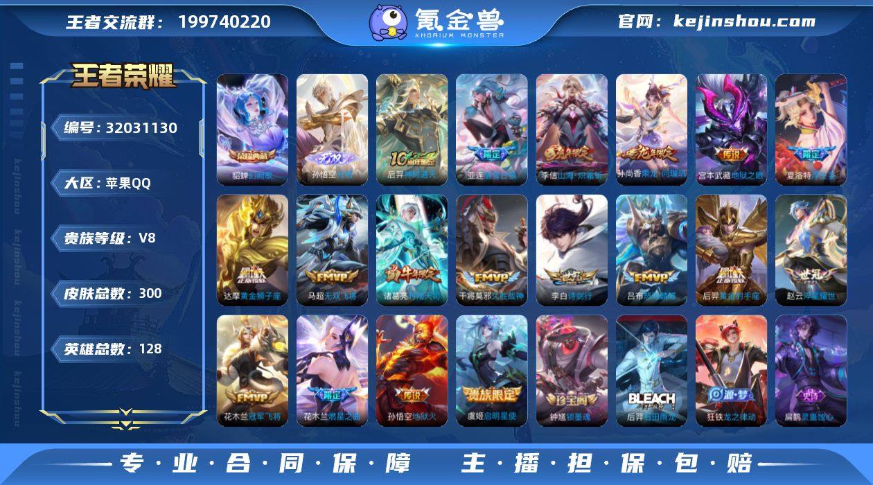 【王者荣耀】珍品无双0 典藏1 无双1 珍品传说0 传说20 史诗86 英雄128 皮肤300 贵族7级 荣耀典藏:幻阙歌__无双皮肤:无相__传说皮肤:无双飞将|启明星使|地狱之眼|地狱火|久胜战神|黄金狮子座|黄金射手座|冠军飞将|淬星耀世|浮生妄|孙尚香-末日机甲|落雪白狼|吕布-曦玄引|怒海麟威|燃星之曲|诗剑行|时雨天司|乘龙·问璇玑|山海·炽霜斩|神树通天__稀有限定:至尊宝|瑞麟志|青龙志|朱雀志|大圣娶亲|飞衡|龙胆|傲雪梅枪|李小龙|梁祝|狮舞东方|暗影游猎|白昼王子|冰锋战神|大漠名商|地狱燃心|繁星吟游|古海寻踪|海滩派对|海盐诗旅|幻夜卜梦|皇家上将|混沌棋|火炮绅士|剑破天穹|江河有灵|金庭之子|狂想玩偶喵|蓝屏警告|黎明之约|魔术师|擒涛扼浪|穷奇|荣光圣徽|沙漠行僧|朔风刀|死亡摇滚|探海日志|饕餮|醍醐杖|天穹祈灯|万华元夜|妄想食味|无心|五谷丰年|纤云弄巧|星界游侠|演武夺筹|夜都怪侠|疑决卦|阴阳师|吟游魔法|优雅恋人|御旌|御銮|御狮|原初追逐者|暗夜贵公子|暗隐猎兽者|白龙吟|缤纷独角兽|冰冠公主|冰雪圆舞曲|苍穹之光|乘风破浪|德古拉伯爵|地狱岩魂|功夫厨神|鬼剑武藏|唤灵魅影|黄金分割率|箭羽风息|节奏热浪|金属风暴|李元芳-蔬乡物语|吕布-末日机甲|魅力维加斯|梦奇-顽趣|偶像歌手|赏金猎手|绅士熊喵|圣诞狂欢|圣诞恋歌|鲁班七号-蔬乡物语|水果甜心|水晶猎龙者|孙策-猫狗日记|天才门将|赵云-未来纪元|星夜王子|摇滚巨星|鹰眼统帅|幽灵船长|遇见神鹿|逐浪之夏|紫霞仙子|噬灭天穹|天穹之誓|修罗|心灵战警|千年之狐|关羽-百相守梦|刘备-百相守梦|孙尚香-时之恋人|舞动绿茵|特工魅影|心灵骇客|谧流熔炉|化蝶舞|御霄|狰|烛龙|原初探秘者|重明|云中旅人|单词大作战|朔望之晖|钟馗-神迹守卫|流音漫舞|暖冬·兔眠|死神来了|灵蛊蚀心|龙之律动|虚灵犬护|石田雨龙|逆浪荇歌|百里玄策-罗小黑战记|鹤鸣心笺|周瑜-线条小狗|...