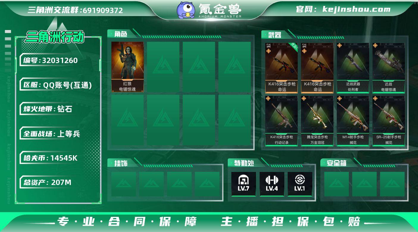 【SJ8392】总资产(M):207M/哈夫币(K):14545K/哈夫币(K):14545K/传说枪皮数:13/全面战场等级:29_段位:上等兵/烽火地带等级:60_段位:钻石/红狼-电锯惊魂/近战-电锯惊魂/近战-处刑者/近战-黑鹰/K416突击步枪-命运/优品C典藏武器外观-K416突击步枪-命运/K416突击步枪-行动记录/SCAR-H战斗步枪-启航/SCAR-H战斗步枪-荼蘼/腾龙突击步枪-万金泪冠/KC17突击步枪-电锯惊魂/S12K霰弹枪-电锯惊魂/M14射手步枪-电锯惊魂/M14射手步枪-蛮荒/M14射手步枪-缄花/SR-25射手步枪-缄花/R93狙击步枪-维什戴尔/.357左轮-缄花/K416突击步枪-阿萨拉特攻/SG552突击步枪-深海恐惧/MP5冲锋枪-战术竞备/MP5冲锋枪-竞技风/MP7冲锋枪-六套之力/S12K霰弹枪-缄默情歌/PKM通用机枪-阿萨拉特攻/M249轻机枪-丛林谍踪/QJB201轻机枪-炽焰/VSS射手步枪-丛林谍踪/M14射手步枪-航天庆典/M700狙击步枪-竞技风/AKM突击步枪-肃杀/QBZ95-1突击步枪-公平竞技/K416突击步枪-一帆风顺/M7战斗步枪-捣蛋鬼/SG552突击步枪-马年新春/SG552突击步枪-贴花艺术/G3战斗步枪-猛禽/CAR-15突击步枪-来财/腾龙突击步枪-冰天雪地/KC17突击步枪-来财/MP5冲锋枪-弄臣/P90冲锋枪-黄昏/P90冲锋枪-捣蛋鬼/UZI冲锋枪-亚特兰蒂斯/野牛冲锋枪-公平竞技/SMG-45冲锋枪-行动开启/SR-3M紧凑突击步枪-马年新春/勇士冲锋枪-冰天雪地/M249轻机枪-冰天雪地/QJB201轻机枪-哈夫克卫队/SKS射手步枪-弄臣/SV-98狙击步枪-星链科技/SV-98狙击步枪-哈夫克航天/SV-98狙击步枪-精英联盟/G18-星链科技/G18-哈夫克航天/Mini-14射手步枪-黄铜/SV-98狙击步枪-马赛克涂装/SG552突击步枪-彩墨涂鸦/M4A1突击步枪-高雅黑/M4A1突击步枪-海色/QBZ95-1突击步枪-高雅黑/QBZ95-1突击步枪-海浪/QBZ95-1突击步枪-2026/K416突击步枪-几何迷彩/K416突击步枪-重击/M16A4突击步枪-高雅黑/AUG突击步枪-浅蓝涂装/M7战斗...