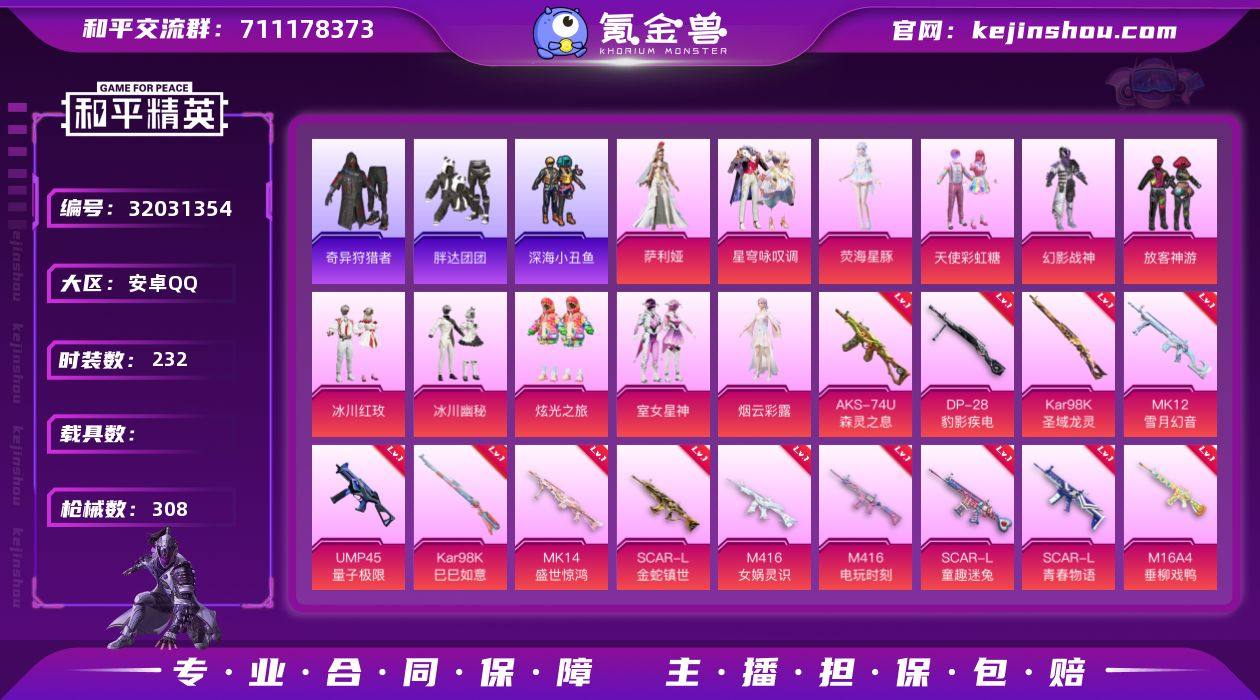 【特价出售/店主推荐】安卓 手Q-9粉装-6特效枪-2载具-2粉色飞行器-51825热力值-13王牌印记-129套装-143枪皮 【热门品类】:套装-浪漫天命,套装-小丑鱼,套装-龟仙人,角色-8号机,角色-Mark.06 【粉色套装】:粉装-虎啸骄阳,粉装-炙焰赤龙,粉装-飓风飞鹰,角色-2号机款机体服,粉装-傲傲奶龙,角色-圣堂之誓,套装-创世·救赎,角色-初号机 觉醒Ver.,角色-凤凰座 一辉 【粉色枪皮等级】:SCAR-L-锦绣绵绵(五级),Kar98K-创世·救赎(六级),Kar98K-巳巳如意(五级),AMR-炫光之旅(七级),M249-绝对恒星(五级),DP-28-豹影疾电(五级) 【粉色载具】:玛莎拉蒂Quattroporte(夜幕蓝),宝马X6 M(曼岛绿) 【粉色枪皮】:SCAR-L-锦绣绵绵,Kar98K-创世·救赎,Kar98K-巳巳如意,AMR-炫光之旅,M249-绝对恒星,DP-28-豹影疾电 【粉色飞行器】:绝对恒星飞行器,极意拳锋飞行器 【粉色降落伞】:绝对恒星降落伞,梦幻火箭降落伞,古战神甲降落伞,炫光之旅降落伞,精灵梦叶罗丽降落伞,创世·救赎降落伞,初号机 觉醒Ver.降落伞,星穹咏叹调降落伞 【稀有套装】:套装-龟仙人,套装-巳巳如意,套装-小鸟芋圆,角色-超感刻度,角色-甜心蒙太奇,套装-雪国风尚,套装-糖糖葫芦,套装-青团波波,套装-棉花软糖,套装-燕燕于飞,套装-鱼渊荷华,套装-粉恋花,套装-紫幽梦,套装-蓝冰羽,角色-瑰梦爱神,套装-极速光影 【稀有枪皮】:AKM-生命誓言,AKM-破晓战魂,AKM-霓虹街区,AKM-龙的传人,M16A4-幻世战舞者,SCAR-L-玉兔迎春,M416-暗夜行者,M416-糯团青竹,M416-红色方程式,GROZA-田园牧歌,AUG-甜蜜菠萝,AUG-耀粉歌者,AUG-绝对恒星,QBZ-彩虹符号,QBZ-洛神天依,M762-天降萌叽,Mk47-洛神天依,Mk47-炫光之旅,G36C-古战神甲,AC-VAL-天降萌叽,AC-VAL-快闪甜心,蜜獾-天降萌叽,蜜獾-娇憨猪猪,UZI-啾咪啾咪,UZI...