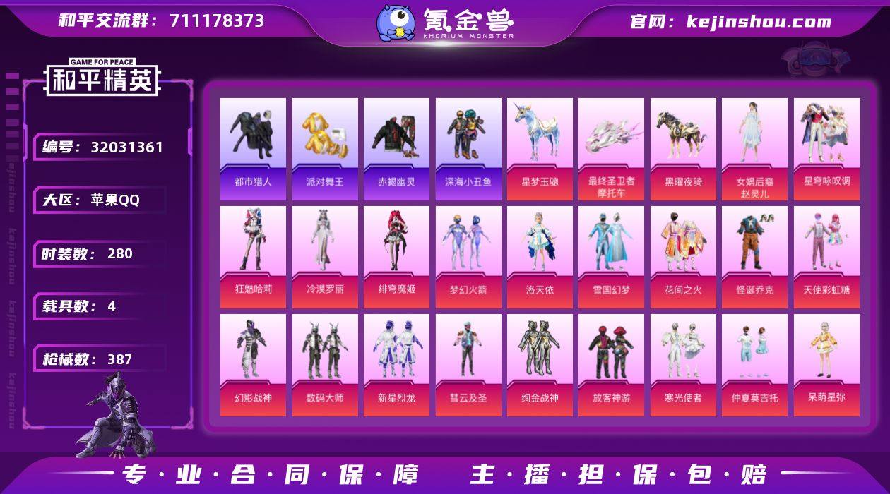 【战神框AUG星梦奇缘 男女小丑冰雪女王 赤蝎金鞋都市男神天网 9级M4灵猫魔法师 M4至情至圣 38特效枪26粉装4载具极品身法素材号 秒换绑不用等】 苹果Q区-142720热力值-历史最高段位:无敌战神-280套装-387枪皮 【4载具】 法拉利Roma(纽博格林银) 最终圣卫者摩托车 星梦玉骢 黑曜夜骑【7稀有】 赤蝎幽灵 都市猎人 派对舞王(金靴子) 派对舞王 萌熊伴侣背包(小熊背包) 天网终结者【26粉装】 怪诞乔克(小丑) 狂魅哈莉(小丑女) 梦幻火箭 雪国幻梦(冰雪女王) 天使彩虹糖 洛天依 绚金战神 数码大师 花间之火 寒光使者 女娲后裔-赵灵儿 放客神游 新星烈龙 憨憨奶龙 萌物绒绒 仲夏莫吉托 呆萌星弥 小可学妹 幻影战神 彗云及圣 角色-冷漠罗丽 角色-电波星 角色-美雪 角色-烟云彩露 角色-绯穹魔姬 星穹咏叹调【37特效枪】 AUG-星梦奇缘(3级) M416-至情至圣(6级) M416-灵猫魔法师(9级) Vector-最终圣卫者(3级) M416-五爪金龙(1级) M416-暖熊萌萌(1级) AKM-炫紫旋律(5级) AKS-74U-森灵之息(4级) Mk14-福马献瑞(5级) ACE32-萌骑漫游(3级) SCAR-L-灵驹仙姬(6级) 破片手榴弹-招财进宝(1级) 燃烧瓶-天降桃花(3级) 烟雾弹-好运连连(1级) AKM-白勺歌姬(1级) SCAR-L-纯梦嫁纱(1级) UMP45-雪国精灵(4级) AUG-星之彼岸(1级) SLR-暗夜玫瑰(5级) MG3-洛神天依(4级) ARX-无垠阁(4级) M762-电糖天使(5级) 汤姆逊-热量炸弹(5级) AKS-74U-无垠阁(3级) 破片手榴弹-粉粉猫爪(7级) GROZA-无垠阁(3级) 烟雾弹-猫咪绅士(5级) AMR-智耀战神(5级) Kar98K-巳巳如意(5级) Vector-绯穹魔姬(2级) Mk14-甜梦熊击(5级) AUG-暖羊咩咩(5级) M416-电玩时刻(5级) GROZA-镜光银凌(5级) DP-28-豹影疾电(5级) MG-36-沧焰双生
