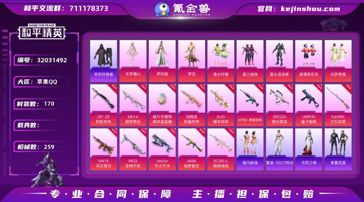 【商品标题】:苹果 手Q-8粉装-9特效枪-6载具-114997热力值-0印记-248套装-314枪皮 【稀有载具】:兰博基尼Estoque(银翼灰),玛莎拉蒂Ghibli(蓝),宾利添越(浅瞪羚棕),迈凯伦570S(天际蓝),帕加尼imola(光影红),时空跃影(星辉银) 【特效枪等级】:AKM-炫紫旋律(七级AKM-炫紫旋律),AKM-绿萝繁花(五级AKM-绿萝繁花),SCAR-L-青春物语(七级SCAR-L-青春物语),M416-心之恋语(五级M416-心之恋语),M416-五爪金龙(七级M416-五爪金龙),AUG-超新星(七级AUG-超新星),M762-激战未来(六级M762-激战未来),Kar98K-巳巳如意(五级Kar98K-巳巳如意),SKS-碧影闪光(五级SKS-碧影闪光) 【优质套装】:粉装-梦幻火箭,粉装-新星烈龙,粉装-潮汐统领,粉装-碧影闪光,粉装-拂晓神骑,角色-白兰星,粉装-萌物绒绒,粉装-闲梦青缨 【稀有套装】:角色-2B战斗服款,角色-2P战斗服款,套装-巳巳如意 【优质武器皮肤】:AKM-炫紫旋律,AKM-绿萝繁花,SCAR-L-青春物语,M416-五爪金龙,M416-心之恋语,AUG-超新星,M762-激战未来,Vector-创世·救赎,Kar98K-梦幻火箭,Kar98K-巳巳如意,SKS-碧影闪光 【稀有武器皮肤】:AKM-2P战斗服款,AKM-冰凉西瓜,AKM-夜灯,AKM-春暖花开,AKM-生命誓言,AKM-胡桃卫兵,AKM-萌趣颜团子,AKM-虎虎生威,AKM-霓虹街区,AKM-龙的传人,M16A4-幻世战舞者,M16A4-机械英豪,M16A4-甜心亚梦,SCAR-L-暗夜玫瑰,SCAR-L-炫彩节奏,SCAR-L-玉兔迎春,SCAR-L-碧影闪光,SCAR-L-红色方程式,SCAR-L-银碳小老虎,SCAR-L-雷霆特警,M416-夜灯,M416-糯团青竹,M416-红色方程式,M416-蓝色火焰,GROZA-2B战斗服款,GROZA-异彩先驱,GROZA-彩虹符号,GROZA-恐龙拽拽,GROZA-懵萌河马,GROZA-治愈之星,GROZA-生命誓言,GROZA-田园牧歌,GROZA-雷霆特警,GROZA-黑色刀锋,AUG-2P战斗服款,AUG-凝视深渊,AUG-天降萌叽,AUG-青春冒险家,QBZ-原初圣火,Q