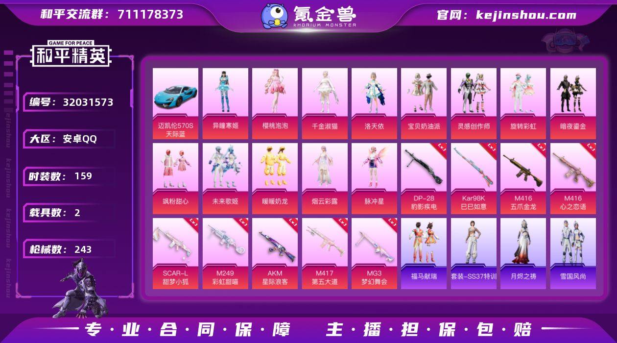 安卓 手Q-5粉装-11特效枪-1载具-1粉色飞行器-57454热力值-12王牌印记-110套装-192枪皮 【热门品类】:套装-浪漫天命,套装-都市猎人,套装-深海小丑鱼,套装-小丑鱼,角色-军刀雅典娜,套装-暗影哥特 【粉色套装】:粉装-炙焰红王,角色-洛天依,粉装-赤焰黑爵,角色-复仇流浪者,角色-凤凰座 一辉 【粉色枪皮等级】:SCAR-L-童趣迷兔(五级),M416-五爪金龙(七级),AUG-星之彼岸(四级),UMP45-相思残雪(五级),Vector-环太平洋(五级),AKS-74U-森灵之息(三级),Kar98K-巳巳如意(五级),DP-28-豹影疾电(五级) 【粉色载具】:玛莎拉蒂Quattroporte(夜幕蓝) 【粉色枪皮】:SCAR-L-童趣迷兔,M416-五爪金龙,AUG-星之彼岸,UMP45-相思残雪,Vector-环太平洋,AKS-74U-森灵之息,Kar98K-巳巳如意,Mk14-福马献瑞,AA12-G-萌骑幻想,DP-28-豹影疾电 【粉色飞行器】:极意拳锋飞行器 【粉色降落伞】:梦幻火箭降落伞,童趣迷兔降落伞,星之彼岸降落伞,相思残雪降落伞,洛神天依降落伞,蓝莓炮弹降落伞,绚金瑰梦降落伞,冷魅冰骑降落伞,筑梦精灵降落伞,炙焰牛王降落伞,妙趣可丽降落伞,环太平洋降落伞,垂柳戏鸭降落伞,星梦奇缘降落伞,临安公主降落伞,星穹咏叹调降落伞,冷漠罗丽降落伞,荧海星豚降落伞,喜羊羊与灰太狼降落伞,异瞳寒姬降落伞,炫彩糖果降落伞 【稀有套装】:套装-巳巳如意,角色-许七安,套装-燕燕于飞,套装-鱼渊荷华,角色-糖霜甜心,套装-萌萌史莱姆,套装-云朵鹅,套装-雪绒豹,套装-朱霞炽焰,套装-凌霄紫焰,套装-擎苍青焰,套装-雨过天青,套装-红釉青花 【稀有枪皮】:AKM-彩虹符号,AKM-影袭,AKM-星之彼岸,AKM-环太平洋,AKM-虎虎生威,AKM-霓虹街区,M16A4-幻世战舞者,M16A4-甜心亚梦,SCAR-L-炫彩节奏,SCAR-L-玉兔迎春,SCAR-L-红色方程式,M416-夜灯,M416-暗夜行者,M416-月...