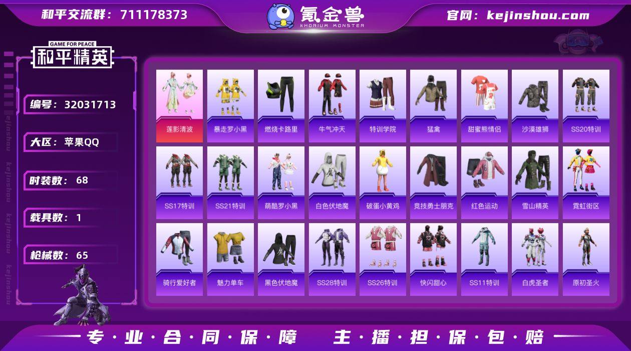 【1载具1粉装 秒换绑不用等】 苹果Q区-19772热力值-68套装-65枪皮 【1载具】 路特斯EV黄色【1粉装】 莲影清波【52热门】 雪山精英(老6服) 破蛋小黄鸡 罗小黑 白色伏地魔 SS8特训 SS6特训 SS26特训 M762-天降萌叽 Mk47-乌木金纹 UMP45-蓝色火焰 AKM-虎虎生威 AKM-霓虹街区 M16A4-魔法学院 M416-蓝色火焰 长空猛禽 甜蜜熊情侣 特训学院 沙漠雄狮 燃烧卡路里 拳皇97八神庵 骑行爱好者 平底锅-五爪金龙 牛气冲天 霓虹街区 魅力单车 竞技勇士朋克 红色运动 黑色伏地魔 M249-古堡领主 M200-酷泡奶龙 SS7特训 SS11特训 SS12特训 SS13特训 SS14特训 SS17特训 SS20特训 SS21特训 SS28特训 爆炸猎弓-花中眠 P92-拳皇97 平底锅-拳皇97 狙击之神 M416-糯团青竹 P18C-原初圣火 Mini14-炫彩节奏 撬棍-传奇侦探 平底锅-原初圣火 白虎圣者 沙漠之鹰-快闪甜心 平底锅-快闪甜心 元素星魂【1飞行器】 粉色滑翔尾迹【5背包】 SS8赛季背包(3级) SS7赛季背包(3级) SS11赛季背包(3级) 霓虹街区背包(3级) 暗夜武装背包(3级) 营地ID:705410258