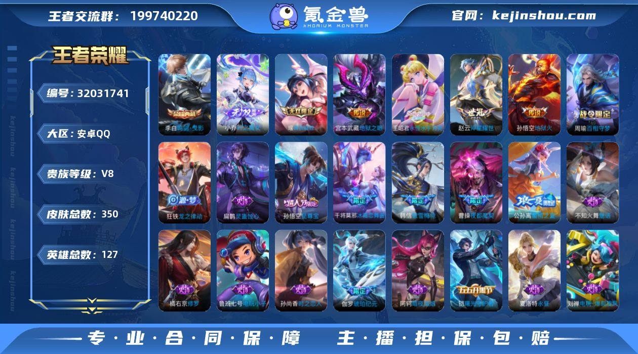 V8 1典藏 2无双 17传说 127英雄 350皮肤 可修改实名 女号 【英雄全皮】司空震全皮,蚩奼全皮,猪八戒全皮,影全皮,大禹全皮 【稀有英雄】大司命,嬴政(始皇帝),韩信(韩跳跳),夏洛特(夏师傅),艾琳,橘右京(橘子),娜可露露(鸟人),不知火舞,赵云,金蝉(唐僧),戈娅 【荣耀水晶】鸣剑·曳影 【无双皮】小乔时之魔女(小乔无双),真我赫兹(瑶)(瑶无双) 【传说皮】吕布曦玄引,貂蝉曦玄引,永恒水手月亮,大乔-时之奇旅,地狱火,地狱之眼,淬星耀世 【珍宝阁皮】妄想食味,优雅恋人,蔷薇恋人,女武神 【赛季/战令皮】噬灭天穹(s37),古海寻踪(s33),海盐诗旅(s30),擒涛扼浪(s31),探海日志(s32),流音漫舞,顽趣-梦奇,地狱燃心,剑破天穹(s35),天穹祈灯(s34),天穹之誓(s36),暖冬·兔眠,御霄(s14),御旌(s15),御銮(s16),朔风刀(s17),混沌棋(s18),疑决卦(s19),醍醐杖(s20),原初探秘者(s21),万华元夜(s22),演武夺筹(s23),驱傩正仪(s24),千军破阵(s25),蓝屏警告,西部大镖客-猪八戒,暗影游猎(游乐娃子),单词大作战,狂想玩偶喵,潮玩骑士王,云间偶戏,星际陆战队-达摩,胡桃异想国,神迹守卫-墨子,航海奇遇记,圣弓游侠,真爱魔法,火炮绅士,沙漠行僧(s26),幻夜卜梦,吟游魔法,夜都怪侠,金庭之子(s27),电玩高手(电玩铁子),午后时光,大漠名商(s28),云中旅人(s29),落雪兰心 【史诗皮】茶境仙,琥珀纪元伽罗,曹操夜都魔契,蔬乡物语(鲁班七号),织梦人,线条小狗-周瑜,线条小狗-小乔,万灵启世,涂山容容,百相守梦-周瑜,灵蛊蚀心,龙之律动,百相守梦-黄忠,紫霞仙子,电玩小子(小书包),特工魅影,千年之狐,永昼,江河有灵,蒙恬荣光圣徽,百解令(蒙犽),高渐离燃音魔法,冰冠公主,青蛇,魅语,暗夜猫娘,电玩·爆裂旋风,末日机甲-吕布,猫狗日记-孙策,猫狗日记-大乔,时之恋人-孙尚香,节奏热浪,修罗,女仆咖啡,摇滚巨星,水果甜心,星夜王子,心灵