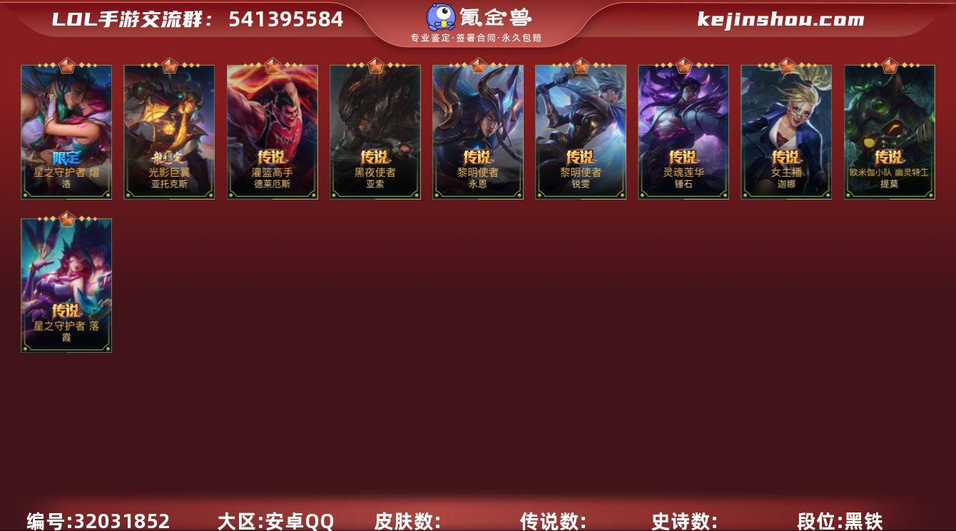 [17331253]3神话 2限定 12传说 48史诗 128皮肤 可二次 可修改实名 【段位】宗师 【神话皮】黎明使者 破晓之殇 佛耶戈,桃映暖春 灼灼芳菲 拉克丝,流光仙韵 莫甘娜 【限定皮肤】星之守护者洛,星之守护者霞 【传说皮】蕊雪盈春:欣荣 永恩,蕊雪盈春 欣荣 永恩,海魔至尊 亚托克斯,光影巨翼亚托克斯,女主播风女,黑夜使者亚索,灌篮高手,星之守护者 落,欧米伽小队 幽灵特工,黎明使者永恩,灵魂莲华锤石,黎明使者锐雯