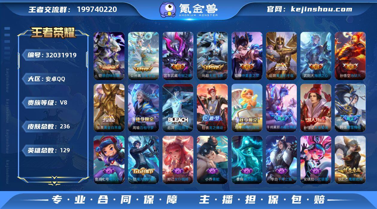 V8 1典藏 15传说 129英雄 236皮肤 典藏英雄武则天 可修改实名 男号 【英雄全皮】空空儿全皮,大禹全皮 【稀有英雄】敖隐(小龙人),大司命,嬴政(始皇帝),韩信(韩跳跳),夏洛特(夏师傅),艾琳,橘右京(橘子),娜可露露(鸟人),不知火舞,赵云,金蝉(唐僧),戈娅 【荣耀水晶】银白咏叹调(倪克斯侍卫) 【传说皮】神树通天,云诺千山,黄金射手座,黄金白羊座,地狱火,仲夏夜之梦(大飞蛾),海洋之心,地狱之眼,末日机甲-孙尚香(绿蚂蚱),无双飞将 【珍宝阁皮】玩趣恶龙 【赛季/战令皮】噬灭天穹(s37),古海寻踪(s33),海盐诗旅(s30),擒涛扼浪(s31),探海日志(s32),天穹祈灯(s34),天穹之誓(s36),炼金王(s6),凯尔特女王(s7),狰(s8),饕餮(s9),烛龙(s10),重明(s11),穷奇(s12),御狮(s13),御霄(s14),御旌(s15),御銮(s16),朔风刀(s17),混沌棋(s18),疑决卦(s19),醍醐杖(s20),原初探秘者(s21),万华元夜(s22),演武夺筹(s23),驱傩正仪(s24),猎兽之王,白昼王子,朔望之晖,沙漠行僧(s26),云中旅人(s29) 【史诗皮】线条小狗-周瑜,九幽镇关,万灵启世,鸭鸭历险记-刘禅,涂山容容,百相守梦-周瑜,石田雨龙,百相守梦-黄忠,龙之律动,紫霞仙子,电玩小子(小书包),黄金分割率,千年之狐,真我赫兹(百里守约),青蛇,偶像歌手,猫狗日记-孙策,猫狗日记-大乔,节奏热浪,女仆咖啡,水果甜心,绅士熊喵,星夜王子,心灵骇客,德古拉伯爵,暗隐猎兽者,幽灵船长,鬼剑武藏,心灵战警,地狱岩魂,缤纷独角兽,乘风破浪,曙光守护者,金属风暴,原初追逐者,圣诞狂欢,圣诞恋歌,鹰眼统帅,王者之锤,暗夜贵公子,魅力维加斯,无心 【限定皮】愿照·九州拓(澜年限),鸣野蒿,白虎志(电光耗子),傲雪梅枪,瑞麟志(木兰年限),遇见飞天,怒海麟威,五谷丰年,冰锋战神,游园惊梦,逐梦之影,朱雀志(守约年限),霸王别姬-虞姬,大圣娶亲,冰霜恋舞曲 【普通皮】雾都夜