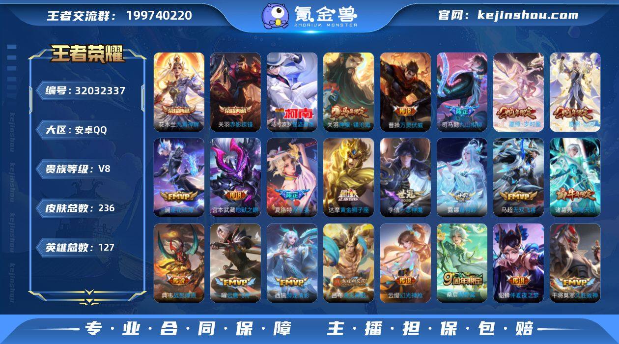 实名: 可修改 性别: 男号 贵族等级: V8 英雄数: 127 皮肤数: 236 荣耀水晶: 九霄神辉,赤影疾锋 珍品传说: 怪盗基德 传说皮: 黄金狮子座,黄金射手座,云鹰飞将,黄金白羊座,久胜战神,一念神魔,仲夏夜之梦,零号·赤焰,地狱之眼,游龙清影,淬星耀世,无双飞将,浮生妄,遇见神鼓,霜月吟,澜逐花归海,典韦战鼓燎原,幻光神枪,九山相柳,万灵伏威,神骥·镇沧海 限定皮: 梁祝,时雨天司,至尊宝,孙行者,猪悟能,玉兔公主,唐三藏,五谷丰年,鸣野蒿,愿照·山河定,愿照·岁时盈 亮点: 【优质装备】:九霄神辉(木兰典藏),赤影疾锋,怪盗基德,黄金狮子座,黄金射手座,云鹰飞将(小将军),黄金白羊座,久胜战神,一念神魔,仲夏夜之梦(大飞蛾),零号·赤焰,地狱之眼,游龙清影(小青龙),淬星耀世,无双飞将,浮生妄,遇见神鼓,霜月吟,澜逐花归海,万灵伏威