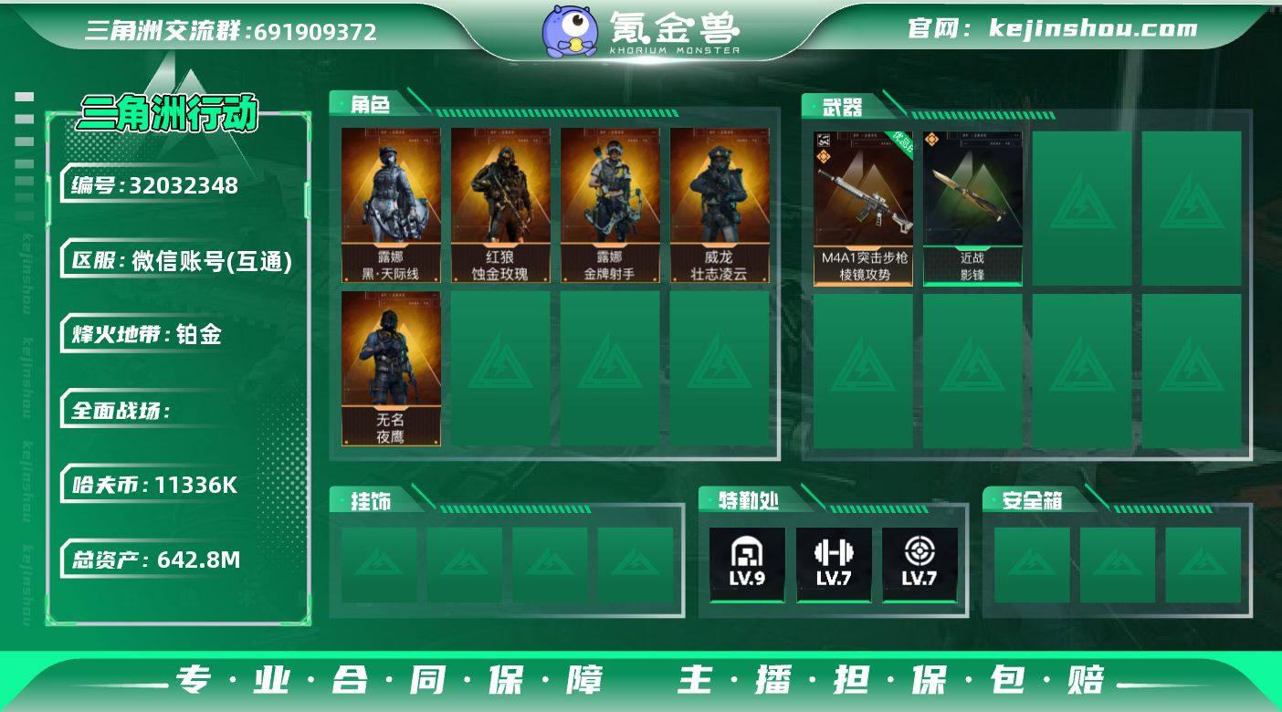 实名:不可二次实名 总资产:642.8M 哈夫币:11336K 烽火地带段位:铂金 烽火地带等级:60 9级仓库,7级训练中心,7级靶场,1级潜水中心,2级收藏室 战术部门等级:3 战斗部门等级:3 医疗部门等级:3 研发部门等级:3 后勤部门等级:3