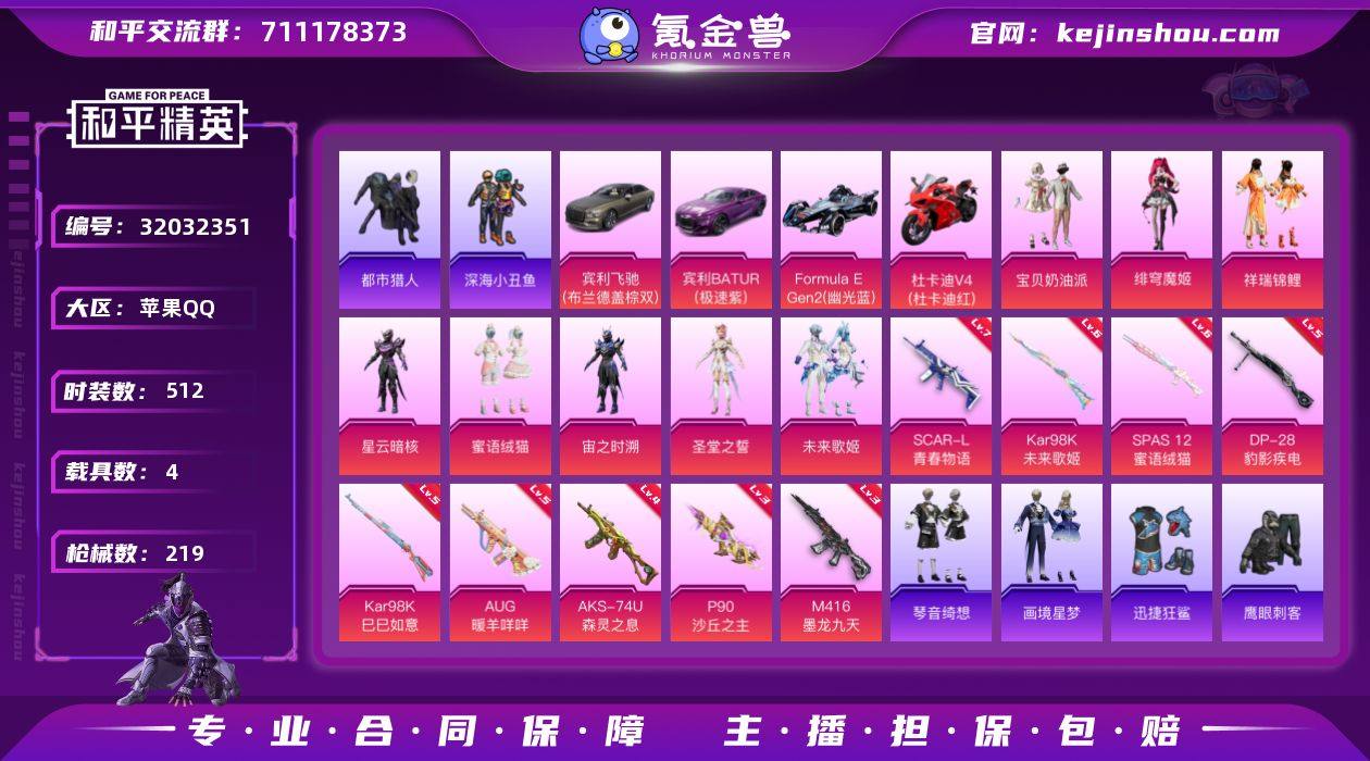 苹果 手Q-13粉装-3特效枪-2载具-2粉色飞行器-77804热力值-9王牌印记-175套装-232枪皮 【热门品类】:粉装-梦幻火箭,套装-深海小丑鱼,套装-小丑鱼,套装-奇异狩猎者,套装-龟仙人,套装-浪漫波比,套装-粉红小猪 【粉色套装】:粉装-幻影战神,粉装-数码大师,粉装-天使彩虹糖,粉装-梦幻火箭,粉装-绿野柔风,粉装-炙焰赤龙,粉装-飓风飞鹰,粉装-暗夜玫瑰,角色-赛罗闪耀型,粉装-彩虹鹿灵,粉装-山涧鹿灵,粉装-沙场疾风,角色-冷漠罗丽 【粉色枪皮等级】:AKM-梦之光华(七级),M416-心之恋语(七级),Kar98K-巳巳如意(五级) 【粉色载具】:兰博基尼Aventador SVJ(翡翠绿),阿斯顿马丁DBS(红) 【粉色枪皮】:AKM-梦之光华,M416-心之恋语,Kar98K-巳巳如意 【粉色飞行器】:梦幻火箭飞行器 【粉色降落伞】:百万伏特降落伞,梦幻火箭降落伞,神秘黑猫降落伞,古堡领主降落伞,四圣焕新降落伞,诡面斩降落伞,阿狸红降落伞,夏日绵绵冰降落伞,烈焰拳霸降落伞,林间仙鹿降落伞,旋转彩虹降落伞,炫彩糖果降落伞 【稀有套装】:套装-龟仙人,套装-巳巳如意,套装-雪国风尚,套装-炫彩糖果,套装-雏菊兔兔,套装-萝兰蝴蝶,套装-小熊娃娃,角色-时希公主 【稀有枪皮】:AUG-冰晶雪宝,AKM-四圣焕新,AKM-彩虹符号,AKM-影袭,AKM-灼热熔岩,AKM-玉龙,AKM-百万伏特,AKM-破晓战魂,AKM-缤纷海域,AKM-萌趣颜团子,AKM-虎虎生威,AKM-霓虹街区,M16A4-幻世战舞者,M16A4-机械英豪,M16A4-甜心亚梦,M16A4-红色方程式,M16A4-蓝色火焰,M16A4-龙虾霸霸,SCAR-L-未来战士,SCAR-L-炫彩节奏,SCAR-L-玉兔迎春,SCAR-L-甜蜜誓约,SCAR-L-红色方程式,SCAR-L-黄金龙骨,M416-动感兔斯基,M416-夜灯,M416-快乐主宰,M416-糯团青竹,M416-红色方程式,M416-蓝色火焰,GROZA-异彩先驱,GROZA-彩虹符号,GROZA-林间仙鹿...