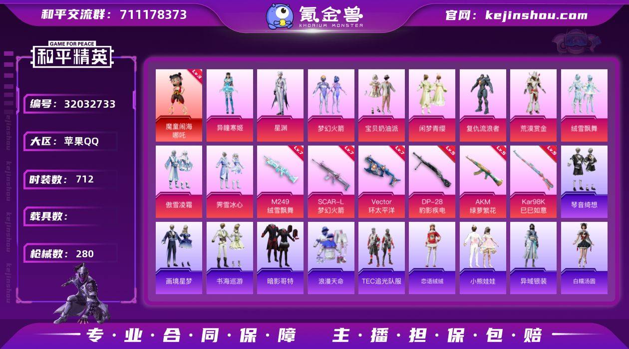 苹果 手Q-18粉装-4特效枪-4载具-42432热力值-6印记-83套装-92枪皮 【稀有载具】:特斯拉Roadster(水滴蓝),兰博基尼Aventador SVJ(翡翠绿),兰博基尼URUS(明艳黄),海龙奔腾 【特效枪等级】:AKM-梦之光华(四级),SCAR-L-梦幻火箭(五级),SCAR-L-童趣迷兔(五级),M416-风花雪月(五级) 【优质套装】:粉装-天使彩虹糖,粉装-梦幻火箭,粉装-苍蓝魅影,粉装-冰霜白皇,粉装-炙焰红王,粉装-铁血龙王,粉装-银龙傲海,粉装-骨龙祭渊,粉装-林间仙鹿,粉装-彩虹鹿灵,粉装-山涧鹿灵,粉装-沙场疾风,粉装-俏雪含霜,粉装-流星咚咚,粉装-冷魅冰骑,粉装-赤焰黑爵,粉装-紫电风暴,粉装-灵感创作师 【稀有套装】:套装-龟仙人 【优质武器皮肤】:AKM-梦之光华,SCAR-L-梦幻火箭,SCAR-L-童趣迷兔,M416-风花雪月 【稀有武器皮肤】:AKM-彩虹符号,AKM-灼热熔岩,AKM-虎虎生威,M16A4-幻世战舞者,M16A4-甜心亚梦,M16A4-蓝色火焰,SCAR-L-玉兔迎春,M416-糯团青竹,M416-红色方程式,GROZA-林间仙鹿,GROZA-田园牧歌,AUG-天降萌叽,AUG-耀粉歌者,QBZ-洛神天依,QBZ-飞驰魅影,M762-天降萌叽,M762-瑞龙福将,M762-风花雪月,Mk47-妙红点点,Mk47-林间仙鹿,Mk47-洛神天依,G36C-冷魅冰骑,AC-VAL-天降萌叽,AC-VAL-彩虹甜喵,AC-VAL-甜心亚梦,蜜獾-天降萌叽,蜜獾-娇憨猪猪,UZI-娇憨猪猪,UZI-影袭,UZI-炫彩节奏,UMP45-仲夏莫吉托,UMP45-夜灯,UMP45-生命誓言,Vector-生命誓言,Vector-田园牧歌,Vector-风花雪月,汤姆逊-林间仙鹿,P90-飞驰魅影,Kar98K-梦幻火箭,Kar98K-洛神天依,Kar98K-飞驰魅影,AWM-垂柳戏鸭,VSS-田园牧歌,Mini14-林间仙鹿,Mini14-梦幻火箭,Mk14-童趣迷兔,Win94-瑞龙福将,SLR-娇憨猪猪,M200-仲夏莫吉托,S1897-暗夜鎏金,S1897-炫彩节奏,S1897-飞驰魅影,S12K-瑞龙福将,...