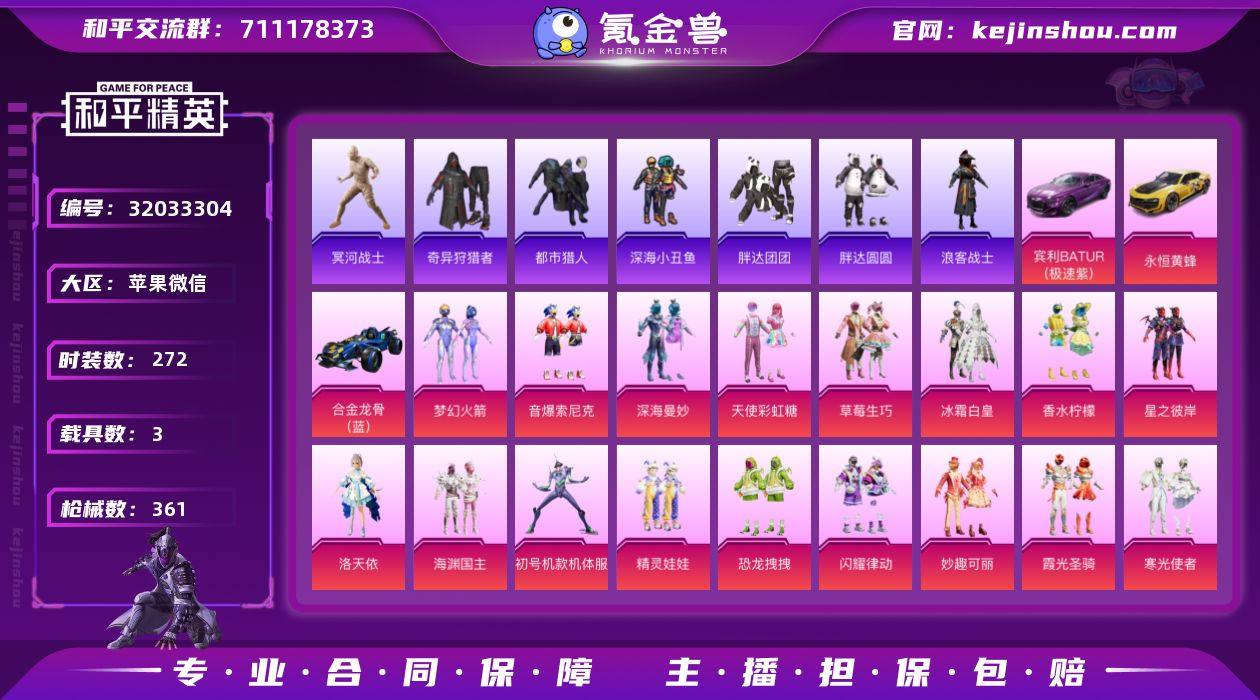 苹果 微信-无敌战神框-20粉装-16特效枪-3载具-4粉色飞行器-137736热力值-32王牌印记-272套装-361枪皮 【热门品类】:粉装-梦幻火箭,粉装-音爆索尼克,套装-都市猎人,套装-冥河战士,套装-深海小丑鱼,套装-奇异狩猎者,套装-胖达团团,套装-胖达圆圆,套装-金羽特工,套装-浪客战士,套装-龟仙人,套装-暗影哥特 【粉色套装】:粉装-深海曼妙,粉装-天使彩虹糖,粉装-梦幻火箭,粉装-草莓生巧,粉装-冰霜白皇,粉装-香水柠檬,粉装-星之彼岸,角色-洛天依,粉装-海渊国主,角色-初号机款机体服,粉装-精灵娃娃,粉装-恐龙拽拽,粉装-闪耀律动,粉装-妙趣可丽,粉装-霞光圣骑,粉装-寒光使者,粉装-音爆索尼克,粉装-幻影飞狐,角色-荧海星豚,角色-奇迹舞步 美雪 【粉色枪皮等级】:AKM-炫紫旋律(四级),AKM-盖世英雄(九级),SCAR-L-纯梦嫁纱(六级),M416-心之恋语(一级),M416-至情至圣(九级),AUG-妙趣可丽(七级),M762-甜心娃娃(七级),蜜獾-异瞳寒姬(四级),UMP45-雪国精灵(七级),P90-粉樱探戈(七级),Kar98K-巳巳如意(五级),AWM-橘柚倾心(四级),S12K-海渊国主(七级),SPAS-12-音爆索尼克(七级),DP-28-豹影疾电(五级),MG3-洛神天依(七级) 【粉色载具】:宾利BATUR(极速紫),永恒黄蜂,合金龙骨(蓝) 【粉色枪皮】:AKM-炫紫旋律,AKM-盖世英雄,SCAR-L-纯梦嫁纱,M416-心之恋语,M416-至情至圣,AUG-妙趣可丽,M762-甜心娃娃,蜜獾-异瞳寒姬,UMP45-雪国精灵,P90-粉樱探戈,Kar98K-巳巳如意,AWM-橘柚倾心,S12K-海渊国主,SPAS-12-音爆索尼克,DP-28-豹影疾电,MG3-洛神天依 【粉色飞行器】:梦幻火箭飞行器,绯月迷踪飞行器,灵猫魔法师飞行器 【粉色降落伞】:深海曼妙降落伞,快乐主宰降落伞,春暖花开降落伞,梦幻火箭降落伞,神秘黑猫降落伞,四圣焕新降落伞,银刃赛罗降落伞,星之彼岸降落...