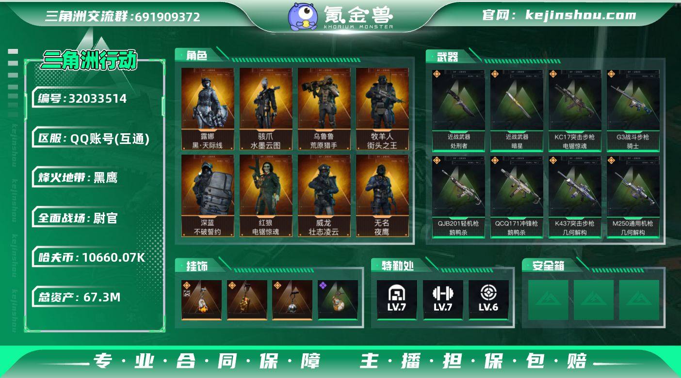 实名:可二次实名 总资产:67.3M 哈夫币:10660.07K 烽火地带段位:黑鹰 烽火地带等级:60 全面战场段位:尉官 全面战场等级:50 7级仓库,7级训练中心,6级靶场,6级指挥中心,2级潜水中心,3级防具台,3级工作台,3级制药台,3级技术中心,2级收藏室 战术部门等级:3 战斗部门等级:3 医疗部门等级:3 研发部门等级:2 后勤部门等级:2 曼德尔砖-气象感应:0 曼德尔砖-命运王牌:0 曼德尔砖-电玩高手:1 曼德尔砖-美杜莎:0