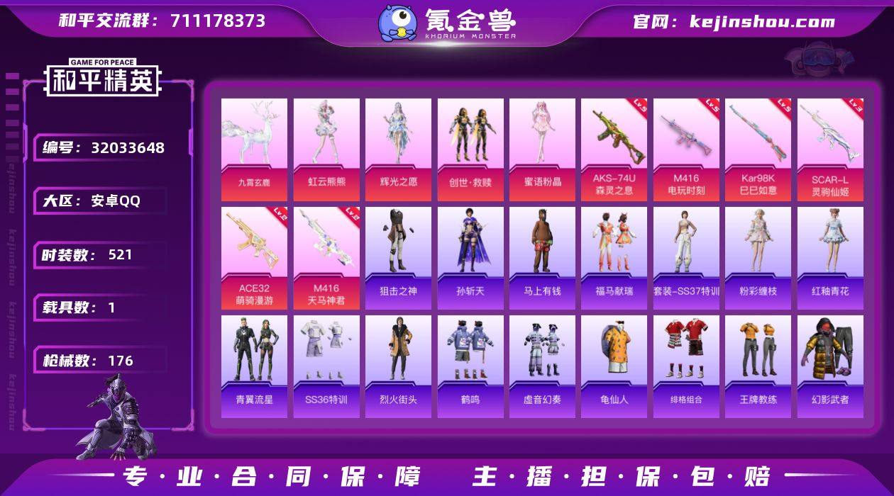 实名:不可二次实名 是否支持人脸包赔:支持 粉装数量:4 特效枪数量:6 载具数:1 时装数:521 枪械数:176 虹云熊熊,辉光之愿,创世·救赎,蜜语粉晶 五级AKS-74U-森灵之息,五级Kar98K-巳巳如意,五级M416-电玩时刻,三级SCAR-L-灵驹仙姬,二级ACE32-萌骑漫游,二级M416-天马神君 九霄玄鹿 狙击之神,孙斩天,马上有钱,福马献瑞,粉彩缠枝,红釉青花,SS37特训,雨过天青,青翼流星,SS36特训,暗影哥特,冰川特警,滨海假日,白色伏地魔,白熊同盟,春光漫游,雏菊兔兔,长空猛禽,创世·幻影,纯真浪花,蝶变,都市魅力,风暴特警,风玲,绯格组合,飞行日记,格斗专家,龟仙人,海岛探路者,鹤鸣,湖蓝色名流,黑色伏地魔,黄色伏地魔,黄色名流,黄色运动,红色运动,幻世战舞者,湖雨初晴,幻羽潜行,幻影武者,极地朋克,酒红色名流,惊鸿侠骨,橘黑制服,娇憨猪猪,竞技达人朋克,竞技角斗士,竞技名士,极速红龙,精神漫游,街头潮人,锦衣飞扬,空岛之星,快闪甜心,临安公主,蓝彩潮人,龙的传人,烈火街头,猎鹰,萝兰蝴蝶,猎梦纪元,蓝色运动,龙腾端午,恋语绒绒,冷焰舞者,Mark.06,猛禽,萌黄之夏,魅力单车,麻辣教官,萌趣咩咩,霓虹街区,柠萌假日,牛气冲天,牛气满满,破蛋小黄鸡,破晓战魂,绮丽涂鸦,青年教官,俏兔智灵,青玉碎影,荣耀,热情海星,人气偶像,燃烧卡路里,热血青春,深蓝色名流,森林游猎者,SS19特训,SS20特训,SS21特训,SS22特训,SS23特训,SS24特训,SS25特训,SS26特训,SS27特训,SS28特训,SS29特训,SS30特训套装,SS31特训套装,SS32特训套装,巳巳如意,探宝勇士,甜蜜菠萝,特殊使命,涂山之恋,特训学院,甜心亚梦,涂鸦旋风,完美偶像,王牌教练,小丑鱼,旭日情侣,夏日倾情,虚音幻奏,耀粉歌者,银尘,元气发射,玉兔迎春,野性战心,焰鹰斗篷,鱼渊荷华,幽夜迷踪,燕燕于飞,战地督导,灼焰舞者 云梦轻舟飞行器,星夜魔法师飞行翼,英伦信使飞行器,辉光之愿降落伞,镜花水月降落伞,灵驹仙姬降落伞,辉云木星降落伞,BEARBRICK降落伞,鬼刀降落伞,幻彩电音降落伞,环太平洋降落伞,辉耀战甲降落伞,金丰海韵降落伞,精灵梦叶罗丽降落伞,未来歌姬降落伞,未来领航者降落伞,星夜魔法师降落伞,炙焰牛王降落伞