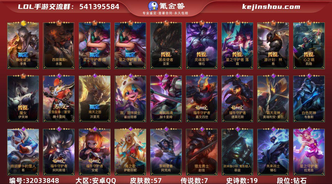 实名: 可修改 段位: 钻石 皮肤数: 57 神话皮: 乘龙破渊 李青 限定皮肤: 星之守护者霞,星之守护者洛 传说皮: 黑夜使者亚索,星之守护者 落,灵魂莲华锤石,源计划:林,心之钢凯隐,魔女伊芙琳,西部魔影 永恩 亮点: 【优质装备】:黑夜使者亚索,星之守护者 落,灵魂莲华锤石,源计划:林,心之钢凯隐,魔女伊芙琳