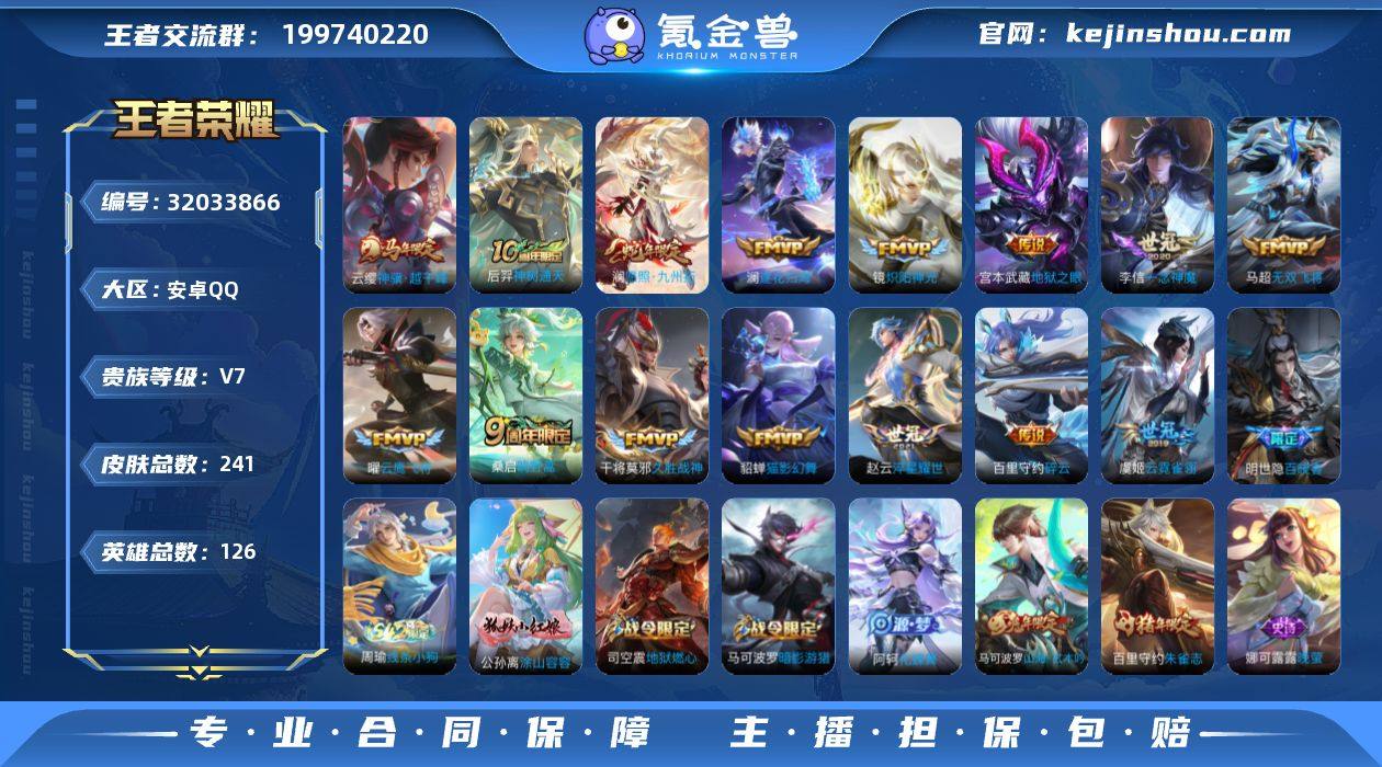 安卓Q-V7-至尊星耀IV段位-126英雄-241皮肤-15传说-65史诗 【英雄全皮】:孙权全皮,戈娅全皮,影全皮 【传说皮肤】:云缨神骥越千峰,后羿神树通天,澜愿照九州拓,桑启鸣野蒿,澜逐花归海,百里守约碎云,马超无双飞将,赵云淬星耀世,镜炽阳神光,曜云鹰飞将,李信一念神魔,貂蝉猫影幻舞,干将莫邪久胜战神,虞姬云霓雀翎,宫本武藏地狱之眼 【限定皮肤】:蔡文姬夏日便利店,虞姬夏日便利店,姜子牙天穹之誓,狄仁杰阴阳师,赵云皇家上将,墨子神迹守卫,庄周高山流水,高渐离玩趣恶龙,元歌无心,马可波罗暗影游猎,马可波罗山海玄木吟,狄仁杰魔术师,狄仁杰万华元夜,达摩沙漠行僧,项羽海滩派对,老夫子航海奇遇记,程咬金演武夺筹,王昭君午后时光,花木兰瑞麟志,亚瑟潮玩骑士王,李元芳云中旅人,钟馗驱傩正仪,鬼谷子原初探秘者,鬼谷子五谷丰年,苏烈千军破阵,百里守约朱雀志,沈梦溪大漠名商,裴擒虎李小龙,裴擒虎擒涛扼浪,狂铁电玩高手,云中君纤云弄巧,上官婉儿梁祝,嫦娥拒霜思,嫦娥暖冬兔眠,西施玲珑珍味,鲁班大师探海日志,桑启海盐诗旅,暃星界游侠,戈娅驭风魔法,艾琳流音漫舞,司空震地狱燃心,阿古朵江河有灵,张良古海寻踪,蒙犽百解令,高渐离燃音魔法,妲己灵卜魔法,鬼谷子天穹祈灯,沈梦溪龙舞盛年,刘邦剑破天穹,周瑜熔金海岸 【年限皮肤】:花木兰瑞麟志,百里守约朱雀志,马可波罗山海玄木吟,澜愿照九州拓 【赛季限定】:鬼谷子原初探秘者,狄仁杰万华元夜,程咬金演武夺筹,钟馗驱傩正仪,苏烈千军破阵,达摩沙漠行僧,沈梦溪大漠名商,李元芳云中旅人,桑启海盐诗旅,裴擒虎擒涛扼浪,鲁班大师探海日志,张良古海寻踪,鬼谷子天穹祈灯,刘邦剑破天穹,姜子牙天穹之誓,东皇太一噬灭天穹,太乙真人谧流熔炉,钟馗虚灵犬护,甄姬逆浪荇歌,亚瑟荣光之誓 【战令限定】:...