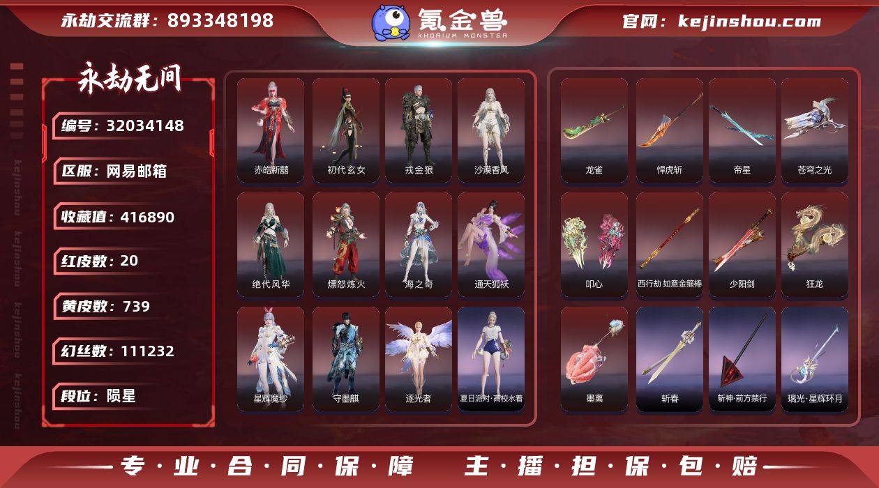 红皮数:20 黄皮数:739 等级:342 幻丝数:111232 收藏值:416890 段位:陨星 通行证:已升级 征神通行证:未升级 版本:终极版 网易支付状态:可注销 换绑冷却:无冷却 是否绑定手游账号:已绑定手游 是否支持人脸包赔:不支持 赤皓新囍,初代玄女,戎金狼,沙漠香风,绝代风华,熛怒炼火,海之奇,通天狐袄,星辉魔纱,守墨麒,逐光者 龙雀,悍虎斩,帝星,苍穹之光,叩心,西行劫·如意金箍棒,少阳剑,狂龙 墨离