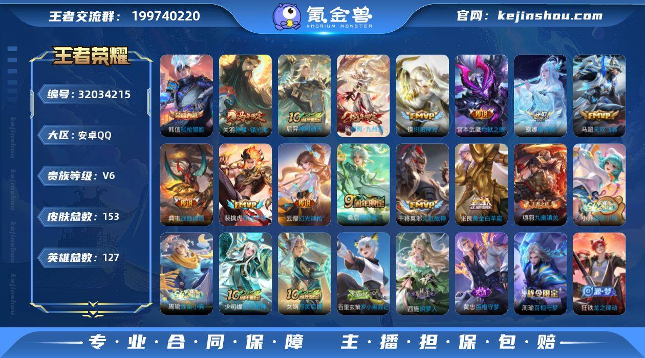 安卓Q-V6-最强王者段位-127英雄-153皮肤-1典藏皮肤-13传说-48史诗HZ2634017 【荣耀典藏】:韩信弑枪猎影 【传说皮肤】:关羽神骥镇沧海,后羿神树通天,澜愿照九州拓,云缨幻光神枪,裴擒虎祥瑞亨通,桑启鸣野蒿,典韦战鼓燎原,露娜霜月吟,马超无双飞将,镜炽阳神光,张良黄金白羊座,干将莫邪久胜战神,宫本武藏地狱之眼 【限定皮肤】:蒙犽顽岩魄,蔡文姬夏日便利店,虞姬夏日便利店,姜子牙天穹之誓,杨戬破阵退雄兵,狄仁杰阴阳师,赵云皇家上将,元歌云间偶戏,元歌无心,狄仁杰魔术师,项羽海滩派对,百里玄策原初追逐者,裴擒虎擒涛扼浪,鲁班大师探海日志,鬼谷子天穹祈灯,姬小满妄想食味,沈梦溪龙舞盛年,刘邦剑破天穹,程咬金群星魔术团,镜青焰无极,周瑜熔金海岸 【年限皮肤】:澜愿照九州拓 【赛季限定】:裴擒虎擒涛扼浪,鲁班大师探海日志,鬼谷子天穹祈灯,刘邦剑破天穹,姜子牙天穹之誓,东皇太一噬灭天穹,太乙真人谧流熔炉,钟馗虚灵犬护,甄姬逆浪荇歌,亚瑟荣光之誓,百里玄策原初追逐者,项羽九幽镇关 【战令限定】:元歌云间偶戏,镜青焰无极,蔡文姬夏日便利店,虞姬夏日便利店,亚连破空之剑,孙悟空神迹守卫,周瑜百相守梦,孙策百相守梦,周瑜线条小狗,小乔线条小狗 【史诗皮肤】:周瑜线条小狗,小乔线条小狗,项羽九幽镇关,少司缘巫礼祀神,女娲万灵启世,百里玄策罗小黑战记,西施织梦人,黄忠百相守梦,周瑜百相守梦,扁鹊灵蛊蚀心,狂铁龙之律动,阿轲化蝶舞,亚连破空之剑,蒙犽顽岩魄,蔡文姬夏日便利店,镜青焰无极,姬小满妄想食味,元歌无心,元歌云间偶戏,百里玄策原初追逐者,孙尚香时之恋人,小乔青蛇,狄仁杰鹰眼统帅,孙策猫狗日记,阿轲节奏热浪,程咬金功夫厨神,李元芳逐浪之夏,刘禅天才门将,铠曙光守护者,百里守约特工魅影,兰陵王暗隐猎兽者,小乔缤纷...