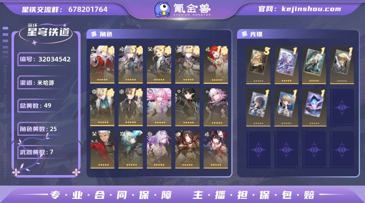 【崩坏·星穹铁道】冒险等级:70,男主,五星数量:32,五星角色:克拉拉 * 4命,布洛妮娅 * 3命,彦卿 * 3命,流萤 * 2命,瓦尔特 * 1命,缇宝 * 1命,砂金 * 1命,银狼,希儿,白露,忘归人,罗刹,刃,丹恒·饮月,遐蝶,符玄,镜流,托帕&账账,真理医生,花火,那刻夏,Archer,长夜月,丹恒·腾荒,昔涟__五星光锥:如泥酣眠 * 3精,记忆的质料,制胜的瞬间,但战斗还未结束,棺的回响,让告别,更美一些,梦应归于何处__四星角色:娜塔莎 * 6命,貊泽 * 6命,黑塔 * 6命,丹恒 * 6命,艾丝妲 * 6命,希露瓦 * 6命,停云 * 6命,三月七 * 6命,青雀 * 6命,佩拉 * 6命,驭空 * 6命,玲可 * 6命,桂乃芬 * 6命,寒鸦 * 6命,雪衣 * 6命,米沙 * 6命,加拉赫 * 6命,虎克 * 5命,阿兰 * 4命,素裳 * 3命,桑博 * 3命,卢卡 * 2命