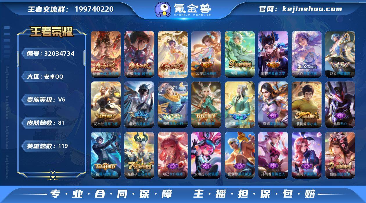 无二次-安卓Q-V6-荣耀黄金II段位-119英雄-81皮肤-10传说-26史诗 【传说皮肤】:云缨神骥越千峰,貂蝉神骥聚万邦,蔡文姬愿照福禄聚,云缨幻光神枪,桑启鸣野蒿,大乔挚爱花嫁,赵云淬星耀世,虞姬云霓雀翎,花木兰冠军飞将,貂蝉仲夏夜之梦 【限定皮肤】:狄仁杰阴阳师,赵云皇家上将,孙尚香蔷薇恋人,庄周高山流水,元歌无心,甄姬游园惊梦,狄仁杰魔术师,狄仁杰万华元夜,达摩沙漠行僧,项羽海滩派对,程咬金演武夺筹,兰陵王金庭之子,后羿圣弓游侠,李元芳云中旅人,钟馗驱傩正仪,干将莫邪真爱魔法,鬼谷子五谷丰年,大乔挚爱花嫁,苏烈千军破阵,沈梦溪大漠名商,裴擒虎李小龙,裴擒虎擒涛扼浪,嫦娥暖冬兔眠,鲁班大师探海日志,桑启海盐诗旅,张良古海寻踪,鬼谷子天穹祈灯,周瑜熔金海岸 【年限皮肤】:蔡文姬愿照福禄聚 【赛季限定】:狄仁杰万华元夜,程咬金演武夺筹,钟馗驱傩正仪,苏烈千军破阵,达摩沙漠行僧,兰陵王金庭之子,沈梦溪大漠名商,李元芳云中旅人,桑启海盐诗旅,裴擒虎擒涛扼浪,鲁班大师探海日志,张良古海寻踪,鬼谷子天穹祈灯,东皇太一噬灭天穹 【战令限定】:干将莫邪真爱魔法,后羿圣弓游侠,嫦娥暖冬兔眠,周瑜线条小狗 【史诗皮肤】:周瑜线条小狗,赵怀真器灵浮梦炉,元歌无心,鬼谷子五谷丰年,庄周高山流水,干将莫邪真爱魔法,裴擒虎李小龙,瑶遇见神鹿,大乔猫狗日记,阿轲节奏热浪,李元芳逐浪之夏,刘禅天才门将,铠曙光守护者,安琪拉心灵骇客,甄姬游园惊梦,小乔缤纷独角兽,夏侯惇乘风破浪,刘禅绅士熊喵,墨子金属风暴,妲己女仆咖啡,孙尚香水果甜心,孙尚香蔷薇恋人,狄仁杰魔术师,貂蝉圣诞恋歌,赵云未来纪元,赵云皇家上将,露娜紫霞仙子 【其他皮肤】:艾琳鹤鸣心笺,刘备浪漫序章,戈娅玫蓝誓约,姜子牙星梦巡礼,东皇太一噬灭天穹,周瑜熔金海岸,鬼谷...
