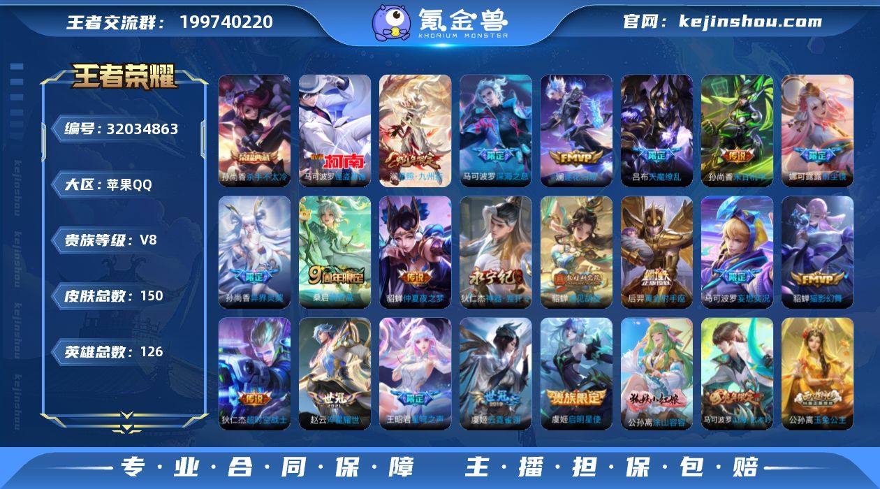 苹果Q-V8-永恒钻石IV段位-126英雄-150皮肤-1典藏皮肤-1珍品传说-19传说-44史诗【英雄全皮】:娜可露露全皮,影全皮【荣耀典藏】:孙尚香杀手不太冷【珍品传说】:马可波罗怪盗基德【传说皮肤】:澜愿照九州拓,桑启鸣野蒿,澜逐花归海,马可波罗妄想实况,狄仁杰神器狴犴令,王昭君星穹之声,娜可露露前尘镜,马可波罗深海之息,孙尚香异界灵契,貂蝉遇见胡旋,赵云淬星耀世,虞姬启明星使,貂蝉猫影幻舞,虞姬云霓雀翎,后羿黄金射手座,貂蝉仲夏夜之梦,孙尚香末日机甲,吕布天魔缭乱,狄仁杰超时空战士【限定皮肤】:蒙犽顽岩魄,蔡文姬夏日便利店,大乔绒语心约,虞姬夏日便利店,姜子牙天穹之誓,狄仁杰阴阳师,赵云皇家上将,孙尚香蔷薇恋人,孙尚香异界灵契,庄周高山流水,钟无艳超时空战士,芈月幻夜卜梦,吕布天魔缭乱,甄姬游园惊梦,甄姬落雪兰心,马可波罗深海之息,马可波罗山海玄木吟,马可波罗妄想实况,狄仁杰魔术师,狄仁杰神器狴犴令,达摩沙漠行僧,项羽海滩派对,貂蝉遇见胡旋,王昭君午后时光,王昭君星穹之声,兰陵王金庭之子,娜可露露前尘镜,后羿圣弓游侠,李元芳云中旅人,虞姬启明星使,杨戬潮玩骑兵,干将莫邪真爱魔法,雅典娜黎明之约,鬼谷子五谷丰年,苏烈千军破阵,公孙离玉兔公主,沈梦溪大漠名商,裴擒虎擒涛扼浪,西施玲珑珍味,鲁班大师探海日志,桑启海盐诗旅,鬼谷子天穹祈灯,伽罗琥珀纪元,刘邦剑破天穹,周瑜熔金海岸【年限皮肤】:马可波罗山海玄木吟,澜愿照九州拓【赛季限定】:苏烈千军破阵,达摩沙漠行僧,兰陵王金庭之子,沈梦溪大漠名商,李元芳云中旅人,桑启海盐诗旅,裴擒虎擒涛扼浪,鲁班大师探海日志,鬼谷子天穹祈灯,刘邦剑破天穹,姜子牙天穹之誓,东皇太一噬灭天穹,太乙真人谧流熔炉,甄姬逆浪荇歌,亚瑟荣光之誓,雅典娜黎明之约【战令限定】:干将...
